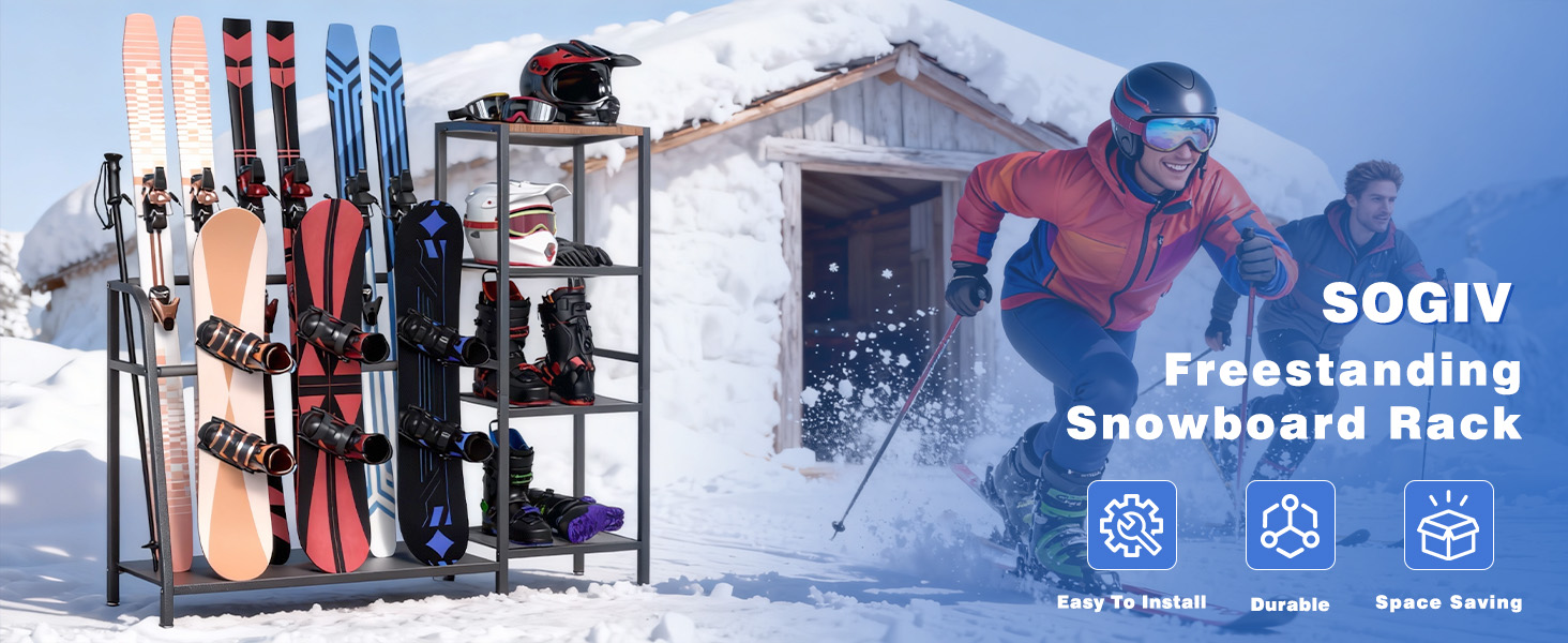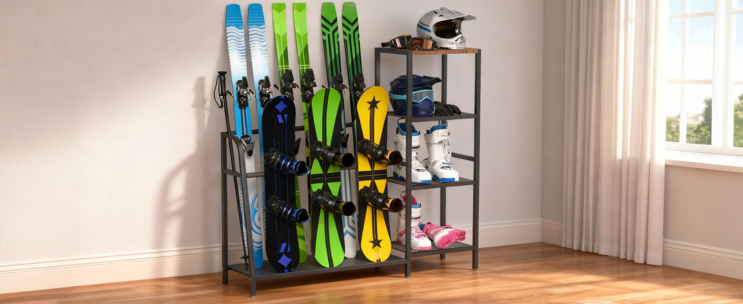 All-in-One Storage Solution - Snowboard rack holds 4 sets of skis and poles, 3 snowboards, plus boots, helmets, goggles, gloves, and accessories—keeping all your gear organized in one sturdy, space-saving rack
