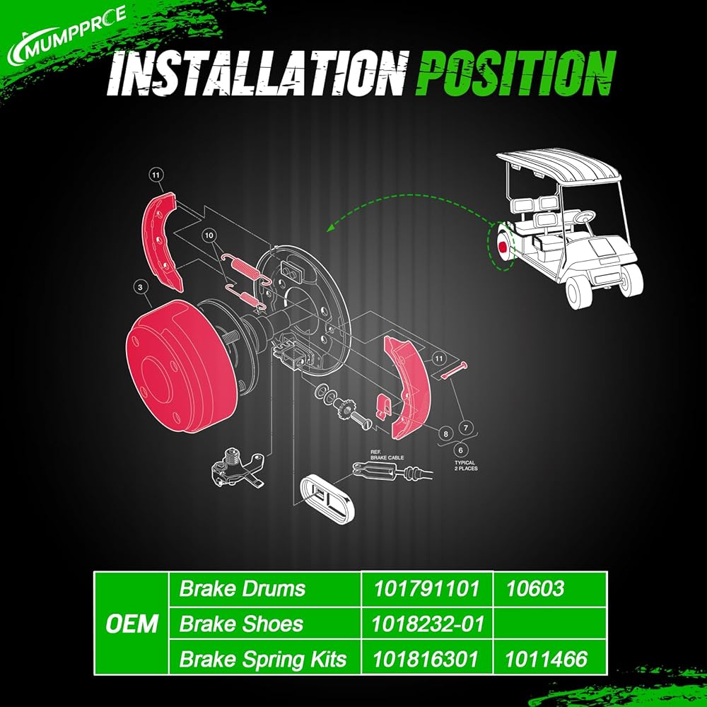 [OEM Replace Number]: Club Car brake hub kit OEM replace number: (brake drums) 101791101, (brake shoes) 1018232-01, (brake spring kits) 101816301