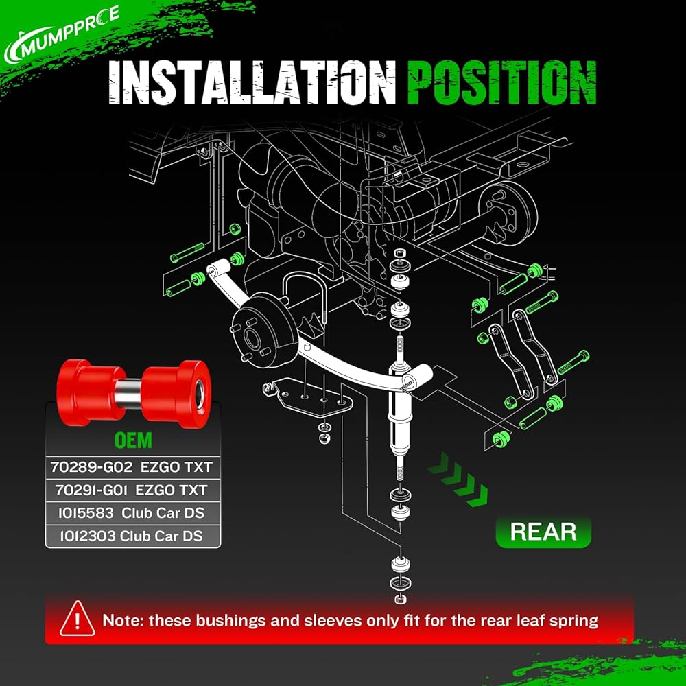 [Complete Kit]: The EZGO TXT rear leaf spring bushing kit contains 12 bushings, 6 sleeves. It replaces OEM bushing part numbers 70289-G01 and 1015583, as well as sleeve part numbers 70291-G02 and 1012303. This ensures a perfect fit and simple installation