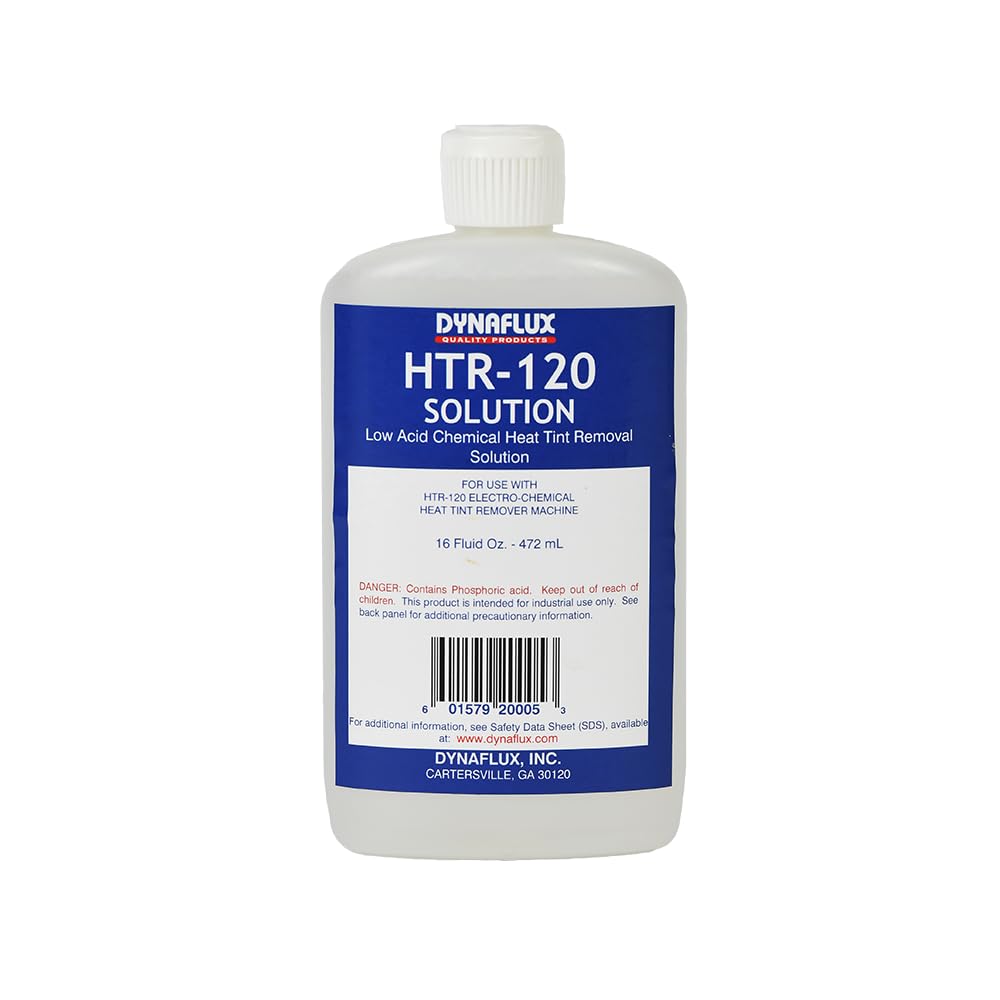 The Dynaflux HTR-120 HTR Solution is a specialized liquid formula developed for use with the HTR500 Heat Tint Removal System. This mild, easy-to-use solution is engineered to remove heat tint and discoloration from stainless steel surfaces that result from high temperatures within the weld zone—such as those produced during TIG welding. When used in conjunction with the HTR500 machine, the HTR-120 helps restore the original metallic appearance of stainless steel by efficiently cleaning and brightening the weld area. Its formulation ensures controlled, consistent performance without aggressive surface etching, making it ideal for precision stainless steel finishing and post-weld cleanup. Packaged in a 16-ounce bottle, this solution is designed for professional welding, fabrication, and maintenance operations that demand high-quality surface restoration and visual uniformity.