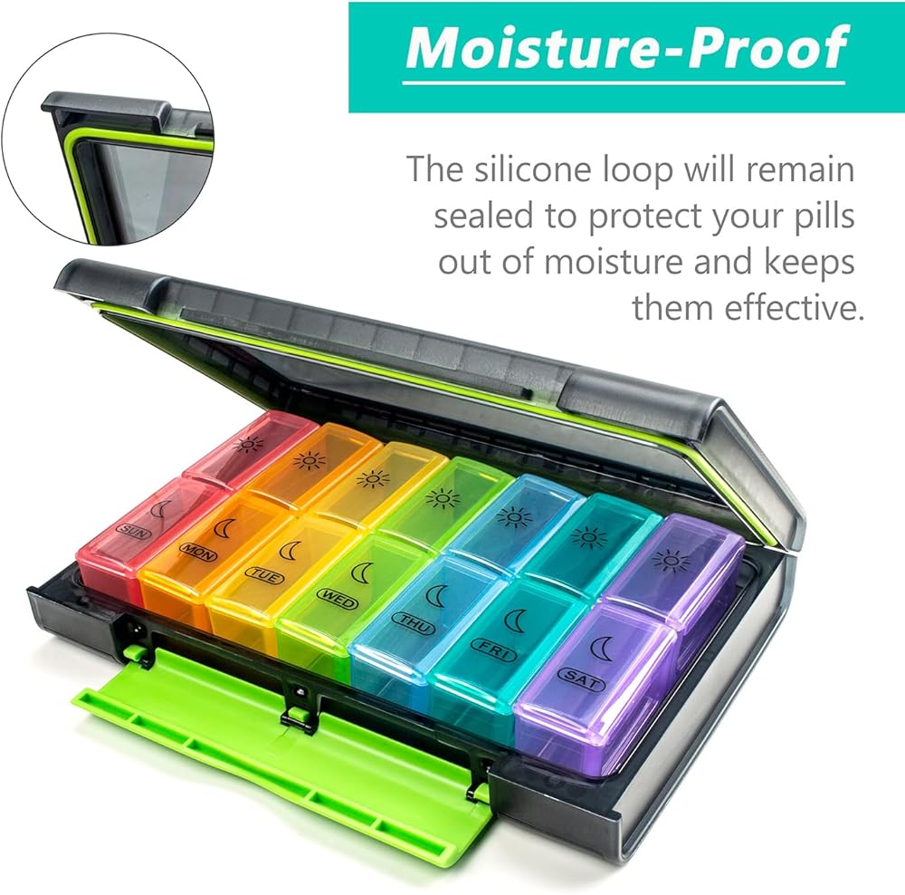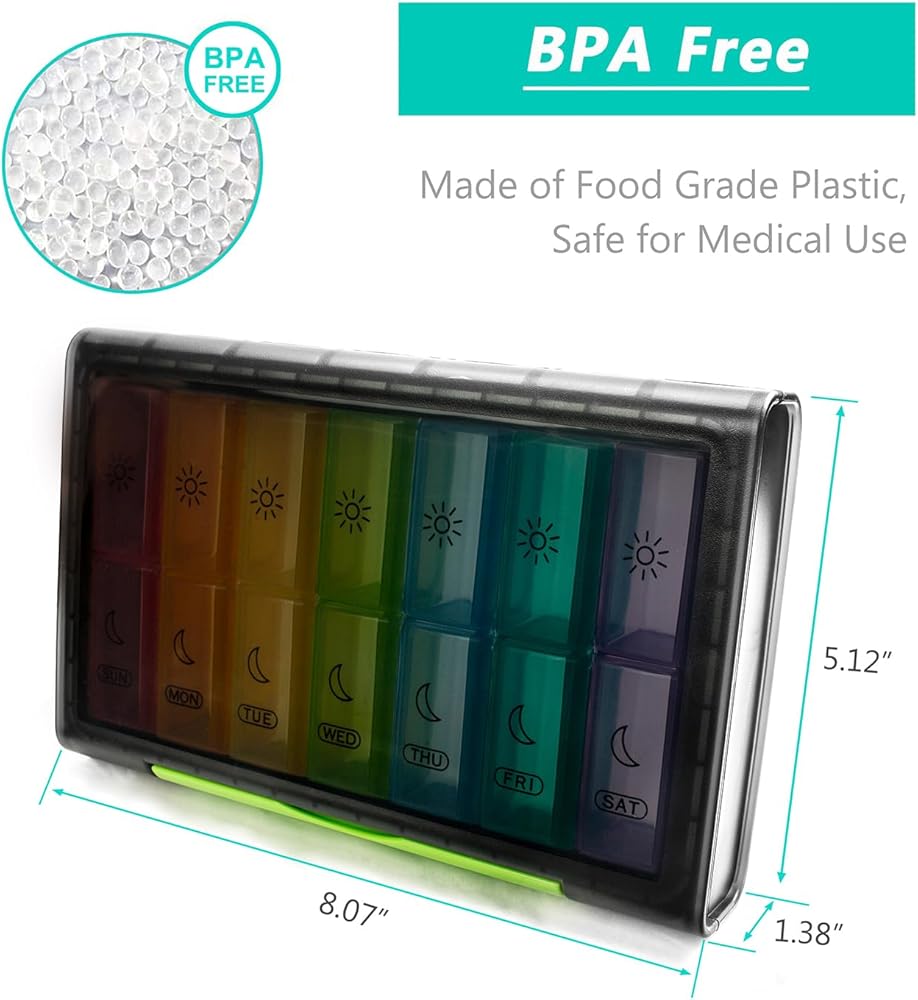 This pill box has seven independent pill containers with clear date labels can hold the whole weekly medication, each bar of the pill dispenser has 2 compartments (Am, Pm), which can perfectly meet your 2 times a day medication requirements.