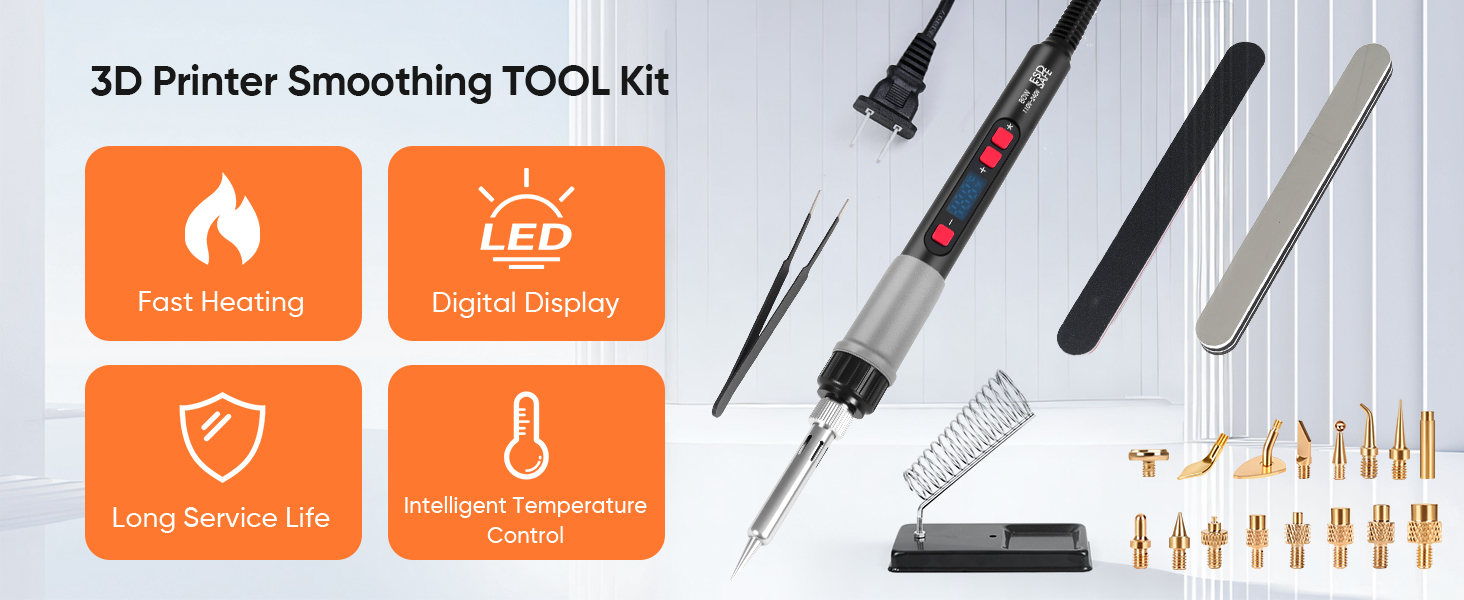 【All-in-One 21-Piece 3D Printer Tool Set】 This versatile accessory kit includes everything you need: 1 x 3D printing soldering iron with a heat-resistant silicone sleeve, 1 x 1/4” brass tip adapter, 9 x brass interchangeable tips,6 x assorted heat-set inserts,2 x sanding sticks,1 x soldering iron holder and 1 x precision tweezer . Designed for both hobbyists and professionals, it streamlines cleaning, repairing, and maintaining 3D-printed components efficiently.