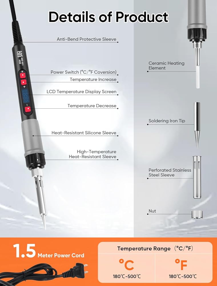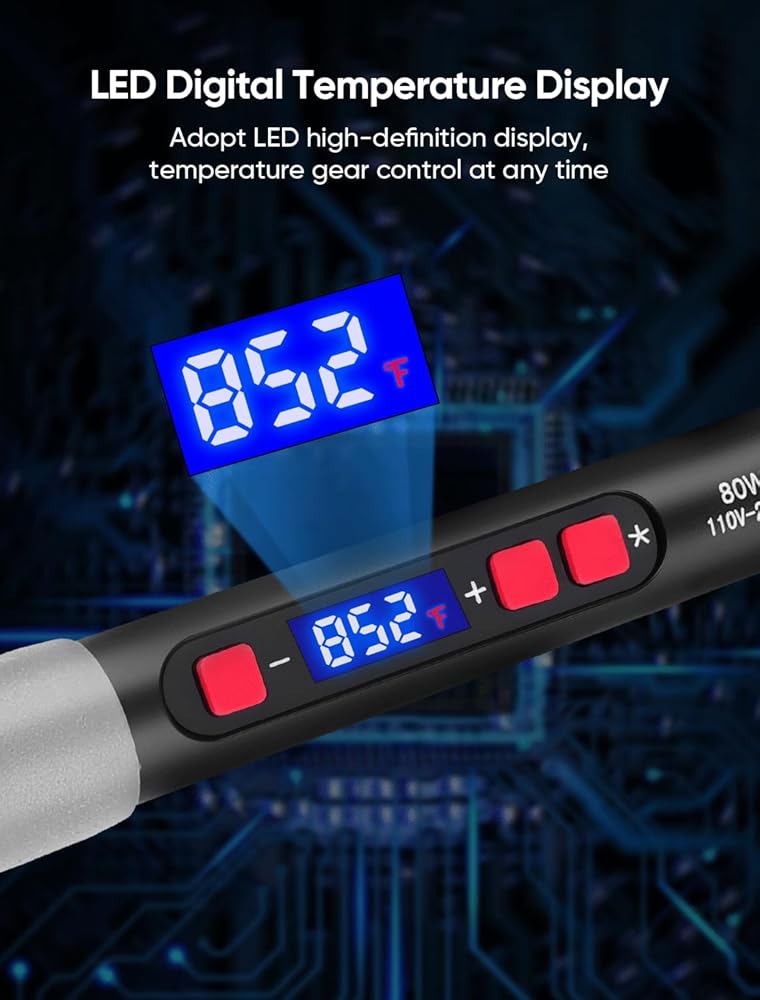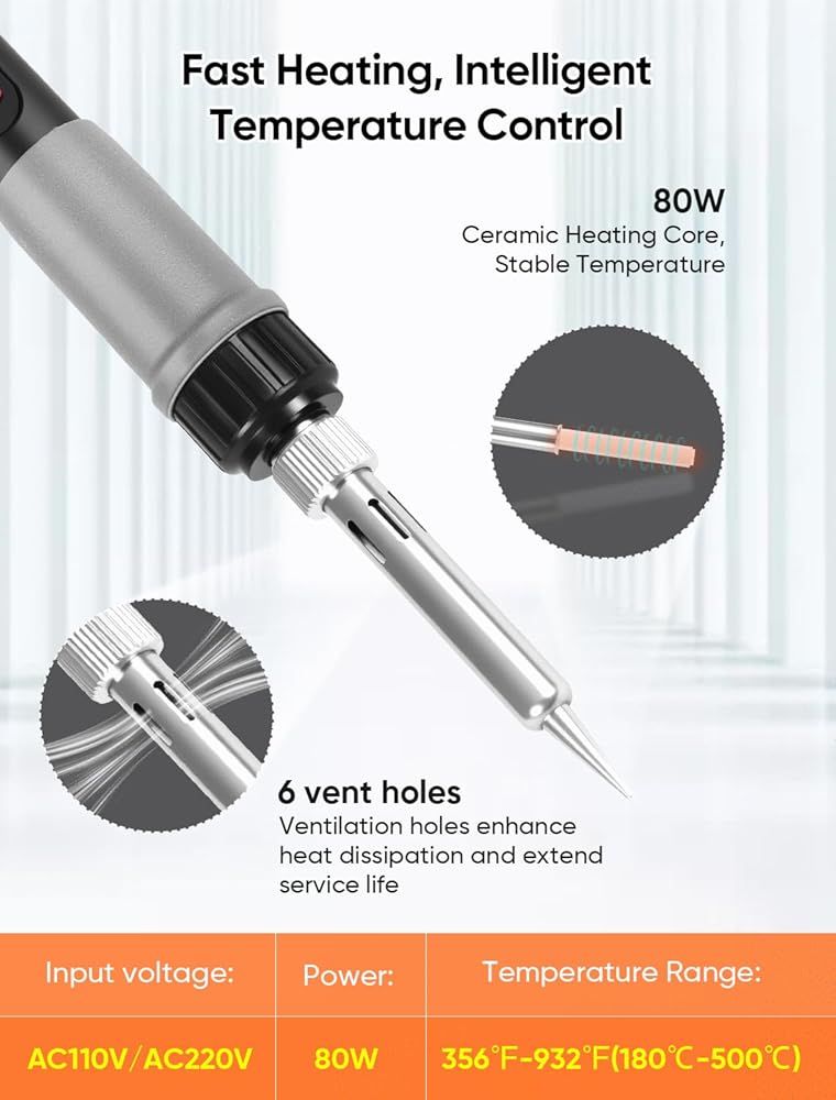 【Rapid Heating & Accurate Temperature Control】 Equipped with a powerful 80W ceramic heating element, the soldering iron reaches working temperature within seconds. The clear LCD display shows precise temperature settings (180°C–500°C / 356°F–932°F) and allows switching between °C and °F. Four air vents enhance heat dissipation, providing safer and more stable performance during use.