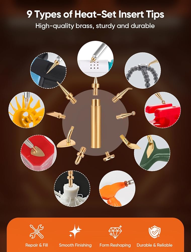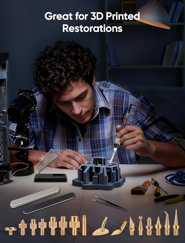 【Ergonomic & Safe Operation】 Simply press and hold the power button to turn on/off — designed with protection to prevent accidental activation. The silicone-coated grip is slip-resistant, comfortable, and insulated for long-term use. Comes with industrial-quality brass inserts and durable tips to strengthen 3D-printed joints. Changing tips requires no tools — just unscrew and replace for quick maintenance. 【Engineered for 3D Printing Tasks】