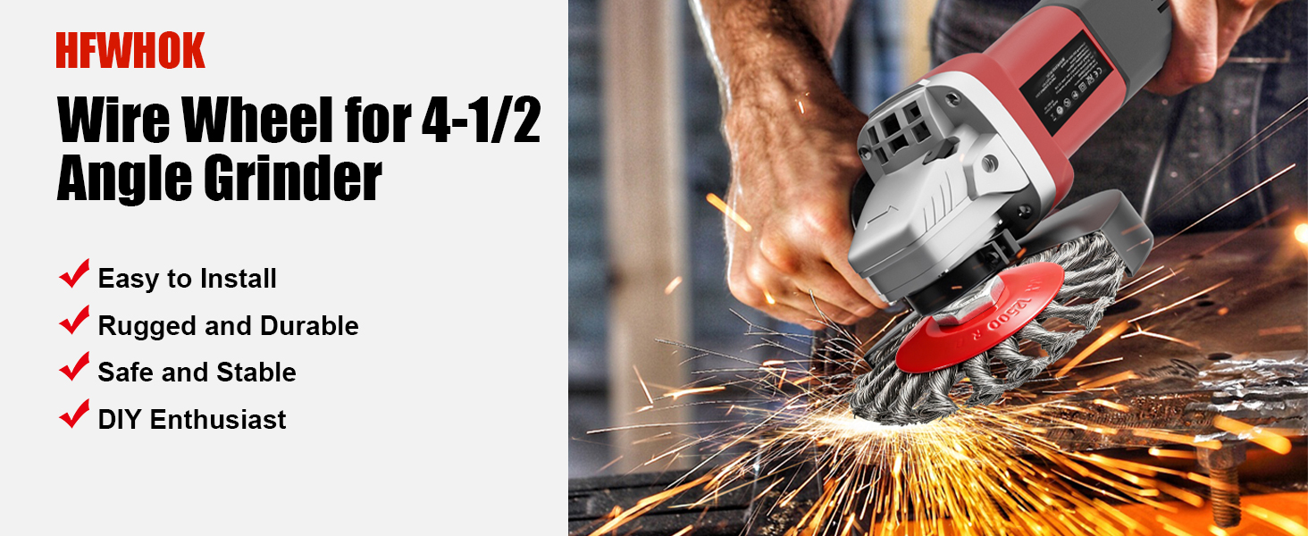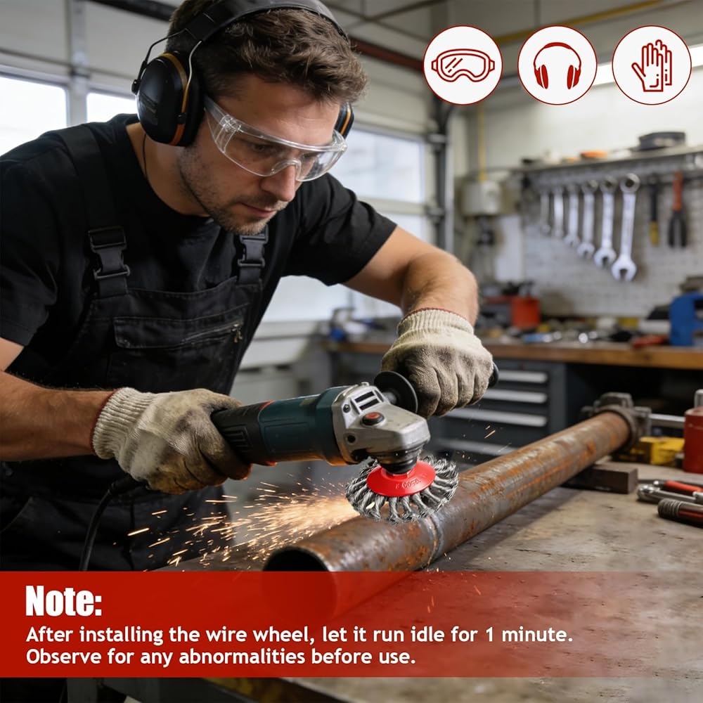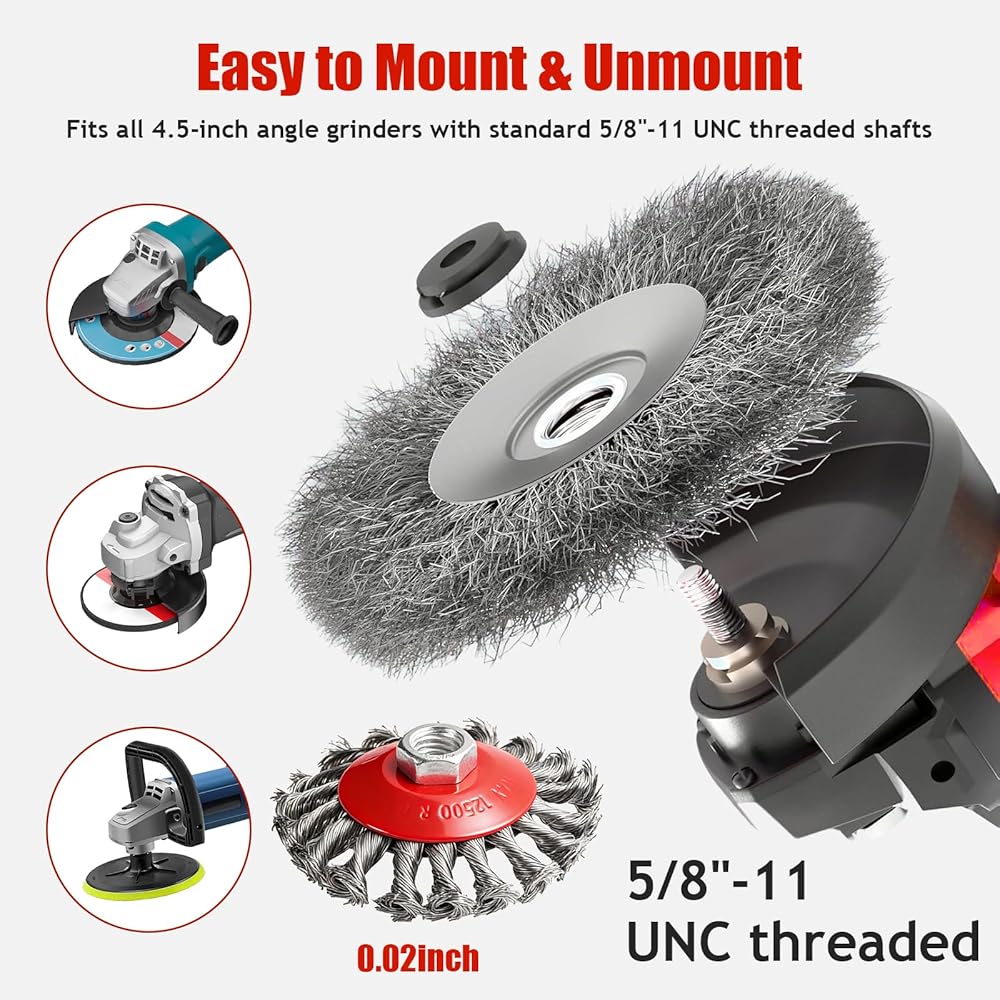UNIVERSAL COMPATIBILITY & TOOL-FREE INSTALLATION: Fits all 4-1/2" angle grinders with standard 5/8"-11 UNC threaded arbors—universal for both professional tradespeople and DIY enthusiasts. Tool-free mounting design allows quick setup without extra tools. Safety Reminder: Always wear protective gear (goggles, gloves, mask) before operation to ensure safe rust removal and cleaning!