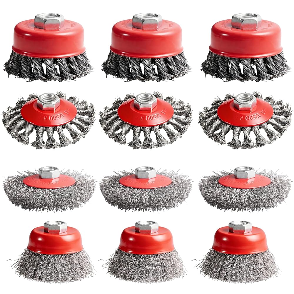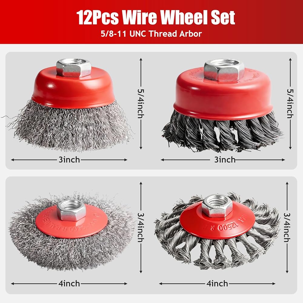 COMPLETE 7-PIECE PROFESSIONAL BUNDLE: All-in-one set covers every grinding/cleaning need: 3*4" knotted wire wheels (aggressive removal), 3*4" crimped wire wheel (gentle polishing), 3*3" knotted wire cup brushes, 3*3" crimped wire cup brushes. Specs: 0.02" thick knotted wires (high rigidity) + 0.014" crimped wires (flexible polishing), max safe speed 12,500 RPM. Multiple sizes/types tackle tough jobs from large surfaces to narrow gaps efficiently.