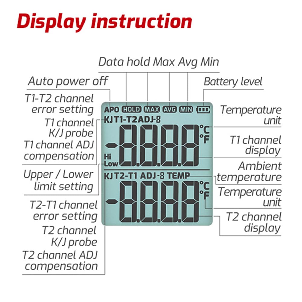 【Dual-channel temperature】Thermocouple thermometer uniquely features T1/T2 dual channels, supporting simultaneous measurement. Thermocouple can also obtain the temperature difference between T1 and T2 channels