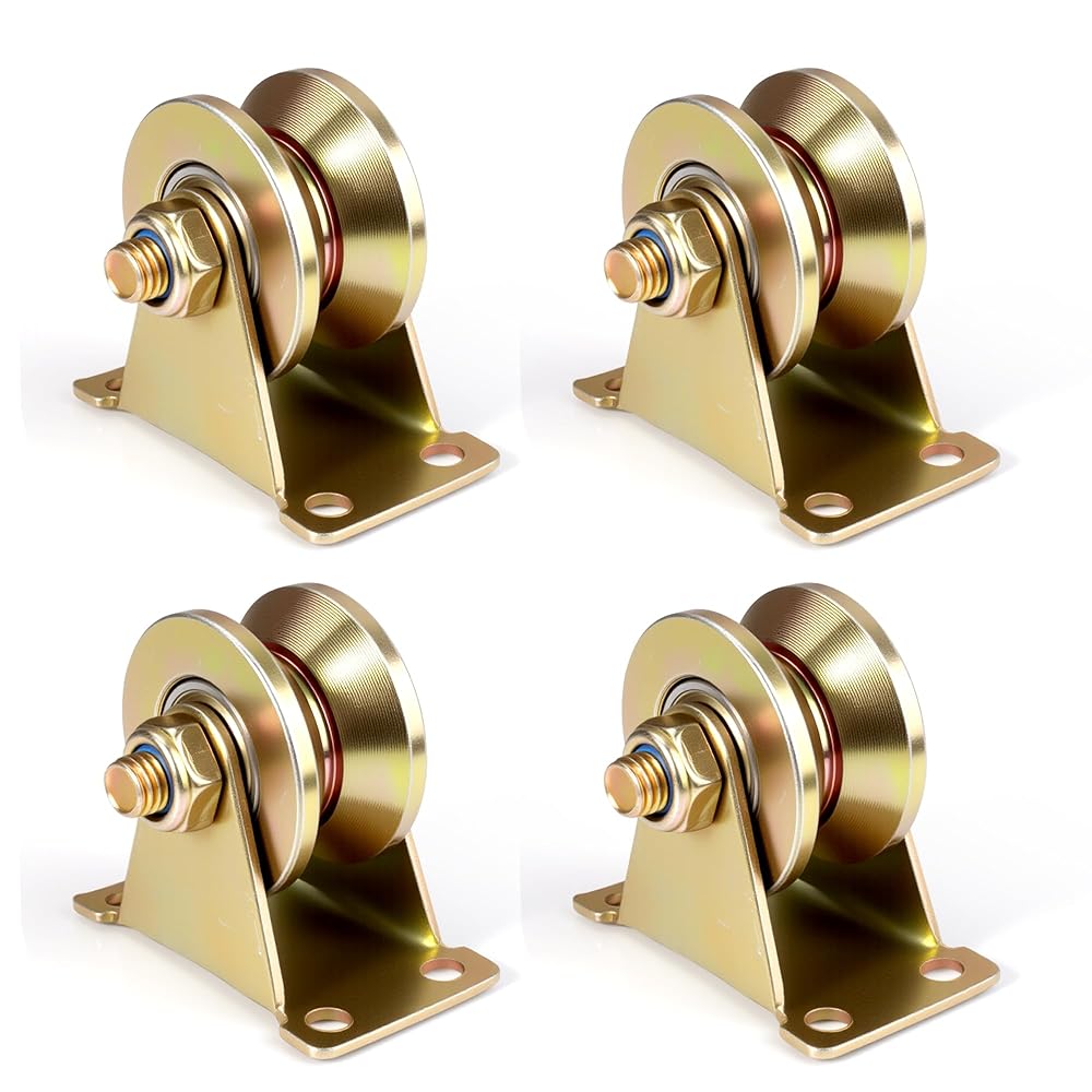 Material: 2 inch v groove wheels made of high quality steel with galvanized, the thickness of bracket is 11 gauge (3mm). These v-groove wheels are precisely machined, solid construct and very smooth rolling, corrosion resistant.Each Contains Two Carbon Steel Ball Bearings to Prevent Jamming.