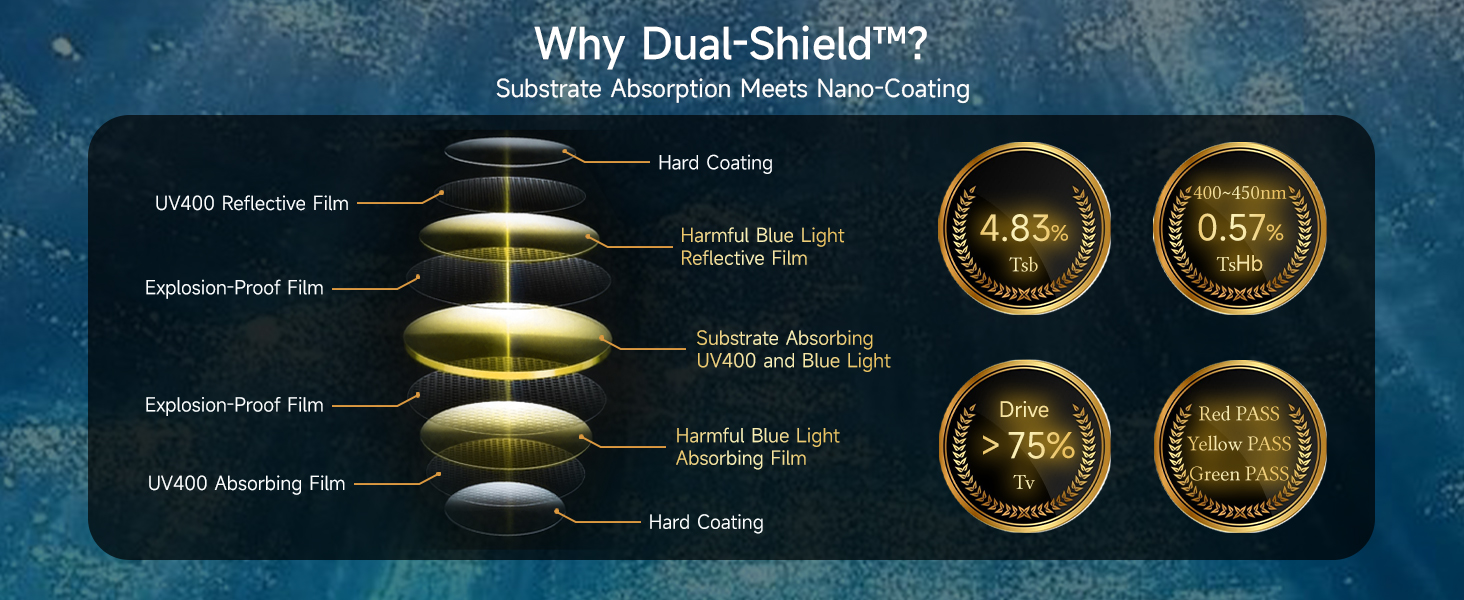 Dynamic Reflection Coating: Due to the professional vacuum coating, lenses may show yellow, amber or blue hues under different lighting, which is a sign of high-precision blue light filtration