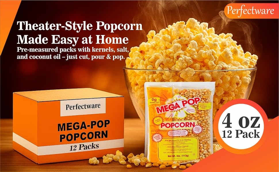 CONVENIENT PACKAGING: Pre-measured 4 oz portion packets containing the perfect blend of popcorn kernels, salt, and coconut oil for consistent results