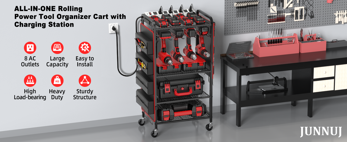 Get Rid of Chaos: Combining storage and charging in one, JUNNUJ power tool organizer cart with charging station would be the game changer for providing you an organized and efficient workspace. Got various tools into one place, helping release space and keeping your tools organized and within reach