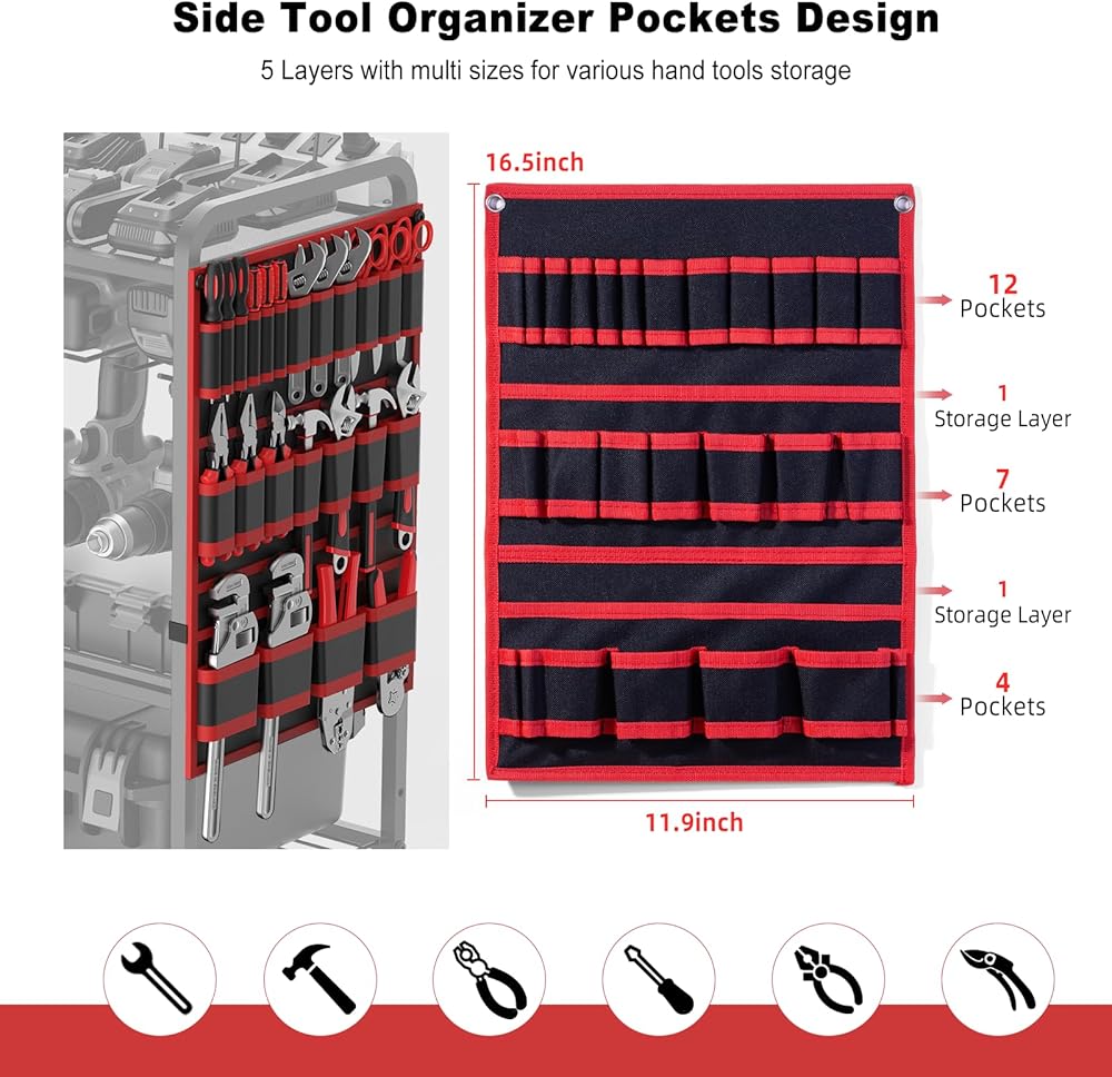 Sides Organizer Pockets And Tool Bag Design: Our large power tool organizer cart on wheels with 8 outlets power strip includes 4 shelves and 1 drills holder layer, which can store up to 8 drills or be used as hooks. One side is organizer pockets design, involve 23 different sizes slots and 2 storage layers. Another side is heavy duty tool bag design, which is detachable, foldable for carrying tools easily to anywhere. Both sides can hold hand tools like forceps, screwdriver, wrench, scissors, hammer, etc. Innovatively equipped with 4 wheels for easily moving