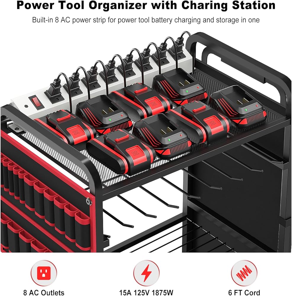 JUNNUJ Large Power Tool Organizer Cart with Charging Station and Heavy Duty Tool Bag, Garage Drill and Tools Battery Holder Storage Rack with 8 Outlet Power Strip, Utility Rolling Shelf on Wheels