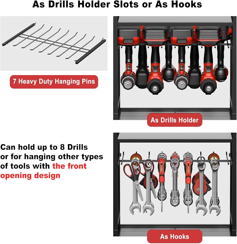 Provide Larger Storage Space: Our power tool storage rack adopts wider and higher design. With the size 34.3 x 17.7 x 11.8 inch, it increases 2 or 3 times storage space. Larger distance between the shelves to accomodate more larger tools. The second layer at the bottom is adjustable, can be moved up and down or removed on demand