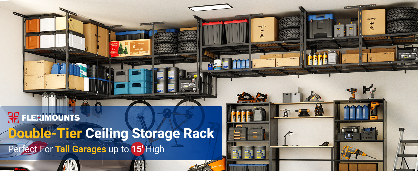 Maximize Vertical Storage for Tall Garages – The FLEXIMOUNTS 4x8 2-Tier Overhead Garage Storage Rack creates twice the capacity of standard racks, turning unused ceiling space into a clutter free, organized area. Perfect for garage organization in 9–15 ft tall garages. For optimal clearance when parking or walking underneath, 2-tier racks are not recommended for garages under 9 ft.