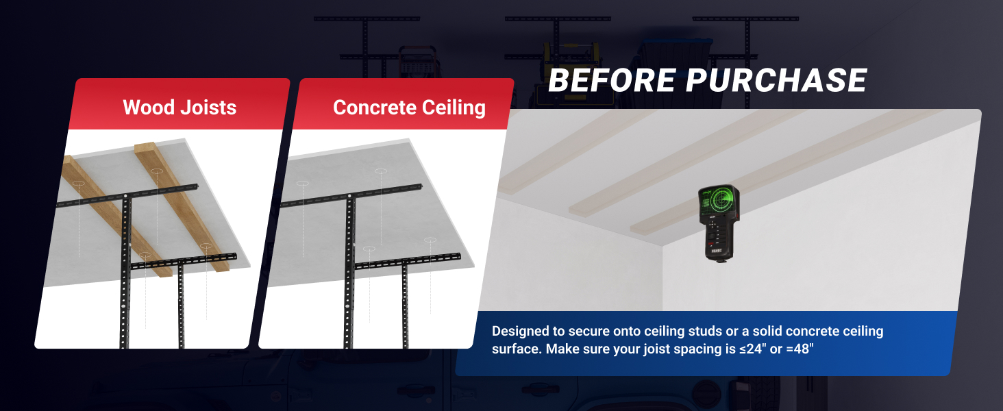DIY-Friendly Installation – Fits ceiling joist spacing ≤24", or 48" for wider joists. Includes template and clear instructions for fast setup, making it the ideal garage ceiling mounted rack for homeowners seeking efficient, clutter free storage solutions.