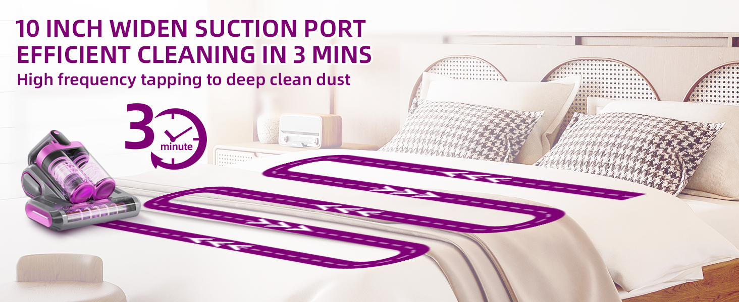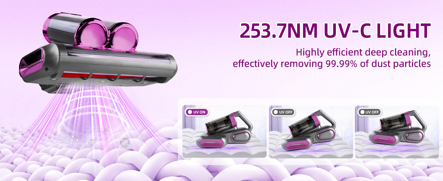 【Multi-function Deep Cleaning System】Combines 253.7nm UV-C light, ultrasonic waves, 16Kpa strong suction, and high-frequency vibration to deeply clean mattresses, sofas, pillows, and fabrics. Effectively lifts hidden dust, allergens, and fine particles to create a healthier sleeping and living environment.