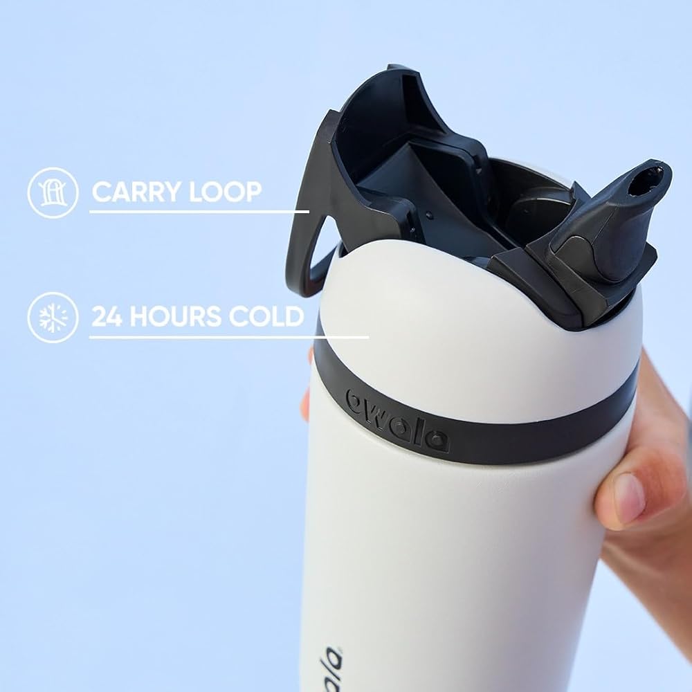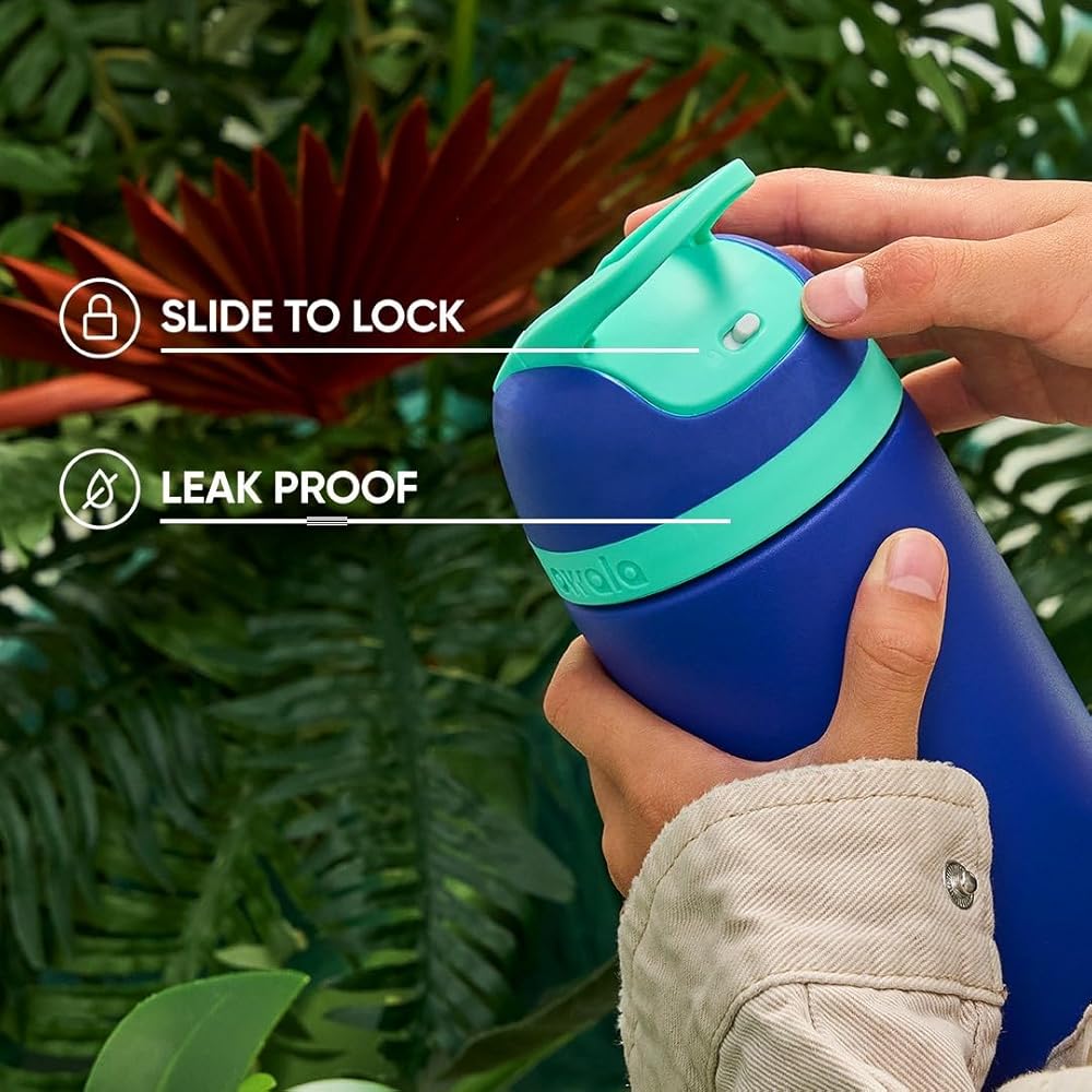 The innovative Owala Flip Insulated Stainless-Steel Water Bottle with Straw and Locking is now available for Kids. The Lid features a hideaway flip straw, enabling easy one-handed use for effortless hydration. The patented flip straw tucks away under a spill-proof locking lid to stay clean and concealed when not in use. Double-wall insulated stainless steel keeps drinks fresh and cold for up to 24 hours. Additional features include a playful color palette, integrated carry loop, cup holder-friendly base, and wide opening for cleaning and adding ice. The Owala Flip Insulated Stainless-Steel Water Bottle with Straw and Locking Lid for Kids is available in size 14-ounce. Lid is dishwasher safe; hand wash cup. Not for use with hot liquids. Manufacturer's limited lifetime warranty.