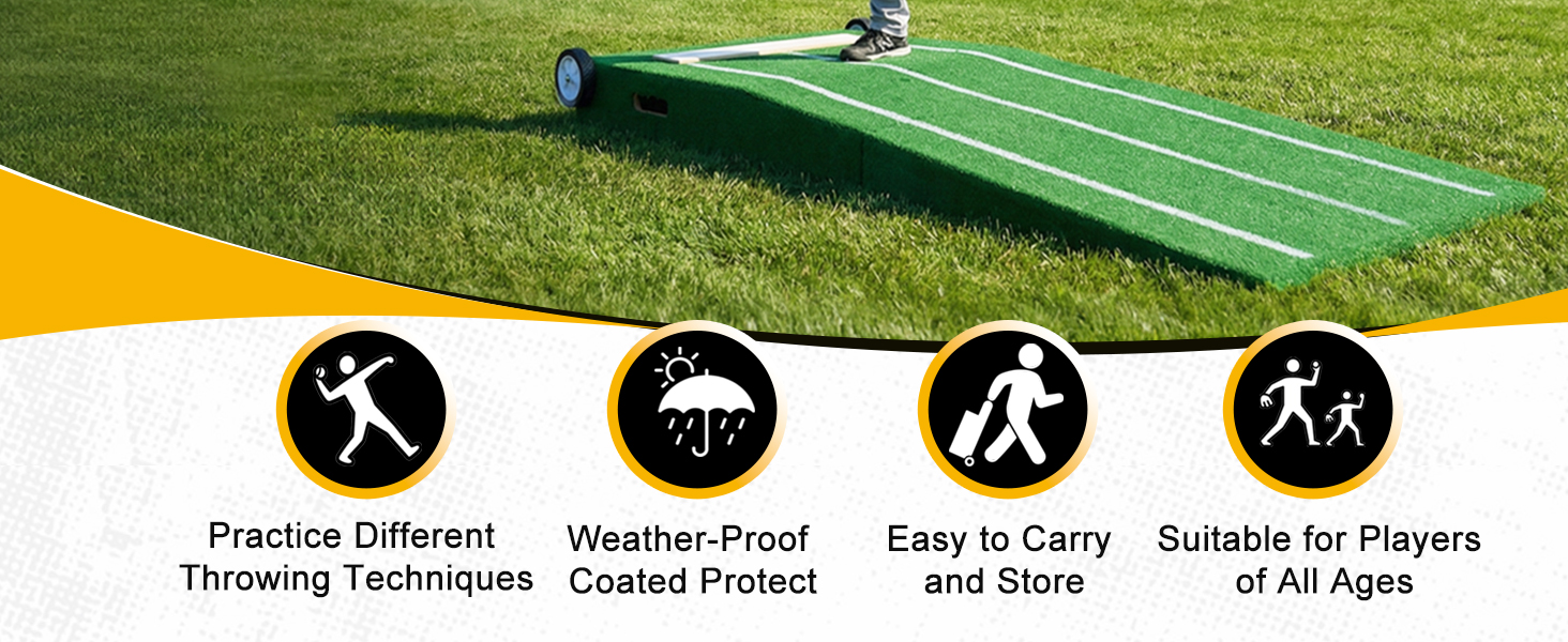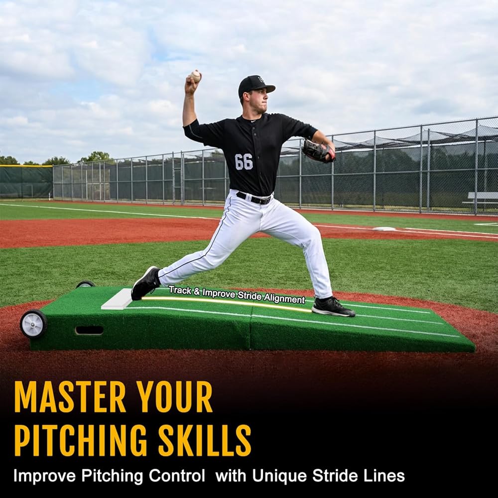 TRAINING ANYWHERE: Equipped with two wheels and a built-in carry handle, this portable pitching mound rolls easily from storage to setup. 80" L x 28" W x 6" H full-size suitable for indoor and outdoor use—perfect for any field lacking a built-in mound. Whether on dirt, concrete, or grass, it delivers reliable performance wherever you need to pitch.