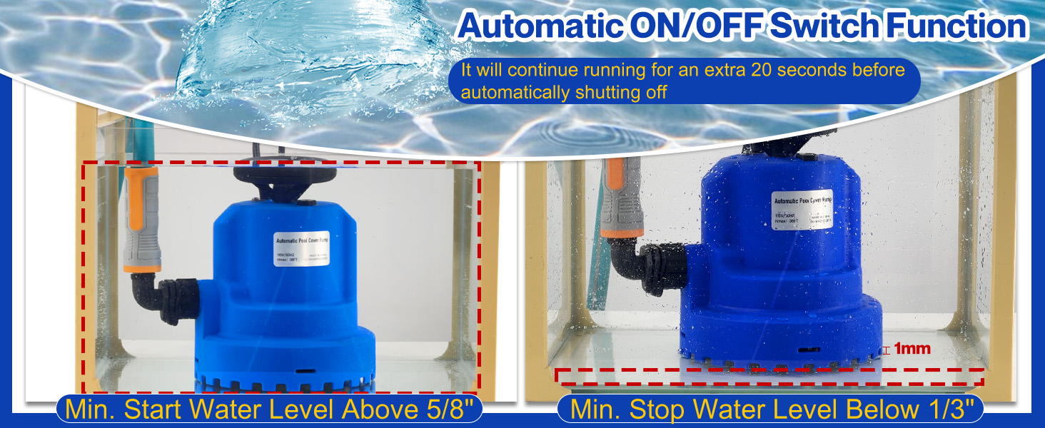 Automatic On/Off Operation: The pool pump has an automatic on/off feature that turns on when the water level reaches 5/8" and turns off when the water level falls below 1/3". The water pump will continue to run for 20 seconds and then automatically shut off. Its bottom suction sump design allows the pond pump to pressurize water down to just 1 mm, making it ideal for flat ground use