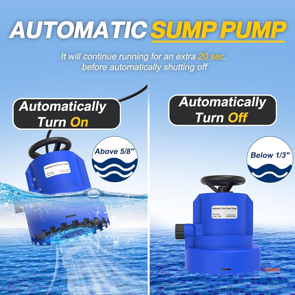 Durable and Safe: The sump pump features a corrosion-resistant thermoplastic casing and includes thermal overload protection that automatically stops the submersible water pump when reaches 105°C/221°F. However, even if the pool cover pump triggers the thermal overload protection mechanism, it will restart after cooling. This automatic pool cover pump is safe to use unattended