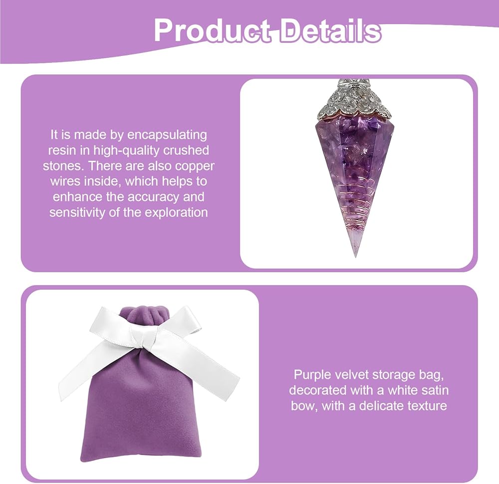 Elegant Amethyst-Inspired Design:Crafted from durable resin with a soft amethyst hue, this pendulum replicates the elegant look of natural amethyst crystal, paired with a fine copper chain for a refined appearance. Each faceted hexagonal cone measures approximately 2.5 inches long with a 9-inch chain, making it a versatile and lightweight choice for divination tools and daily spiritual use.