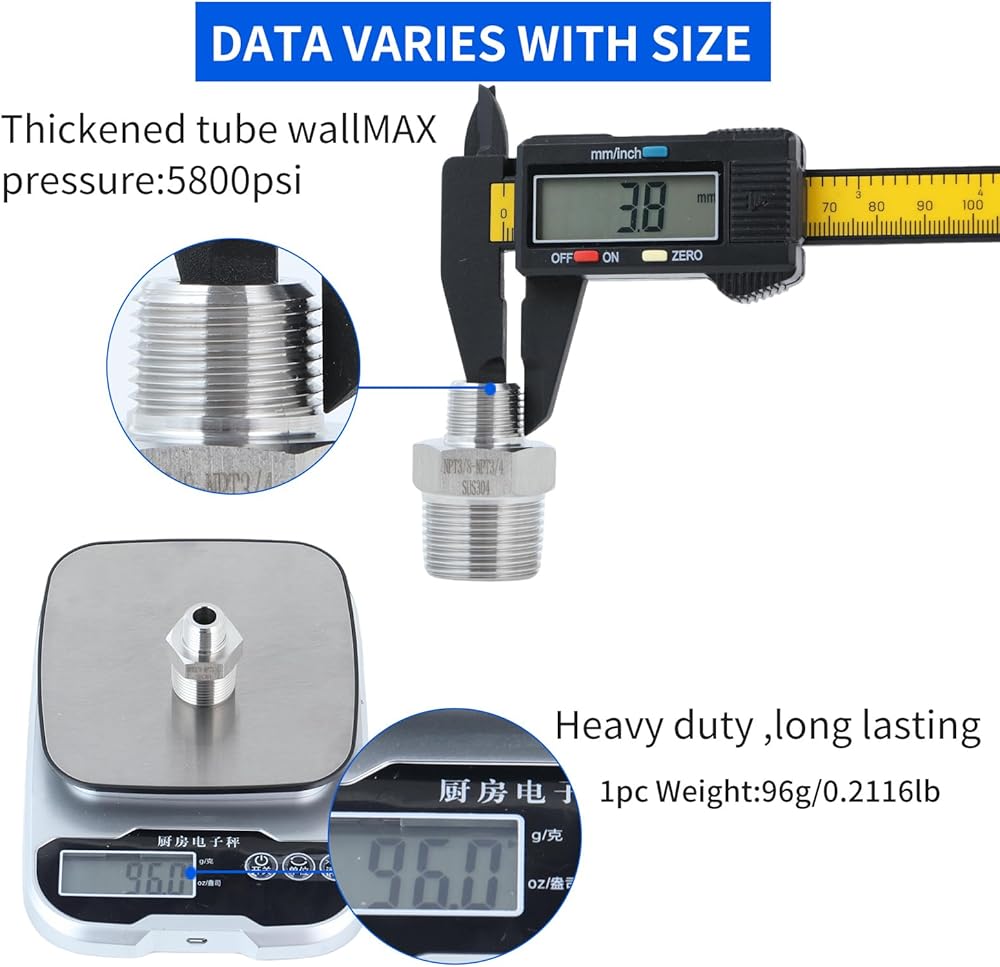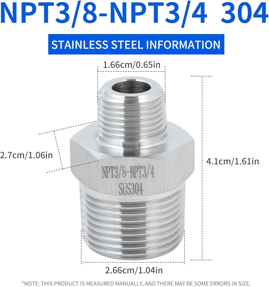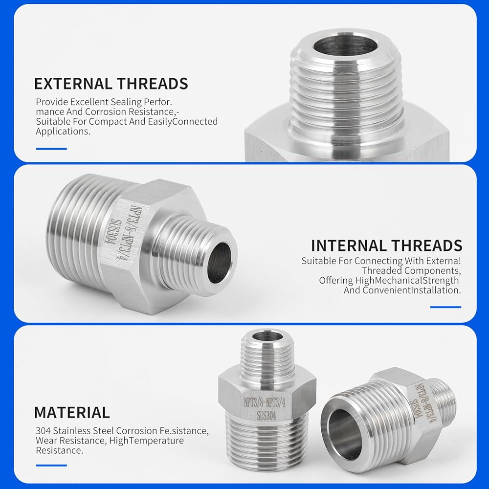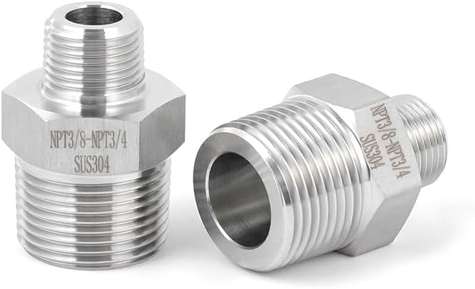 "SHINYERPAN NPT3/8-NPT3/4 is used to connect two pipes with different threads. It is made of stainless steel 304 and can be used in hydraulic systems to circulate liquids and gases. It is manufactured from a solid hexagonal bar and has high-pressure resistance, corrosion resistance, and rust prevention functions, making it suitable for indoor and outdoor use.