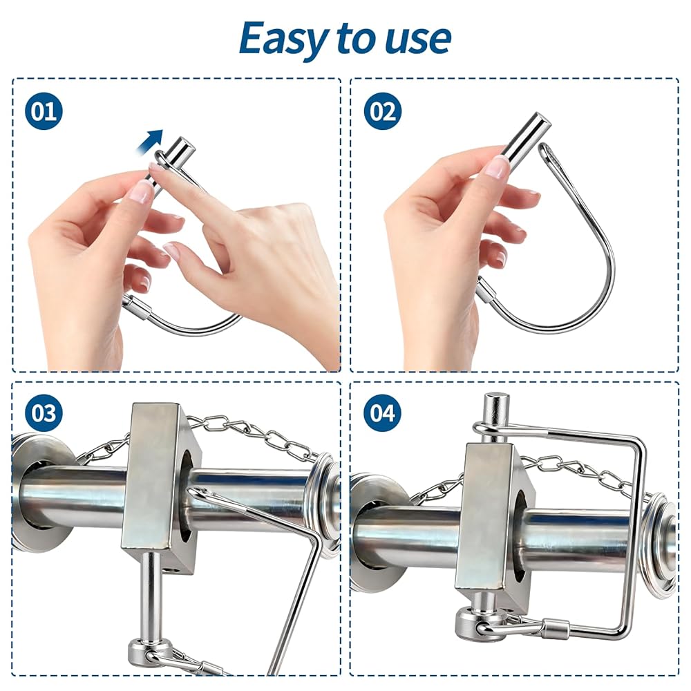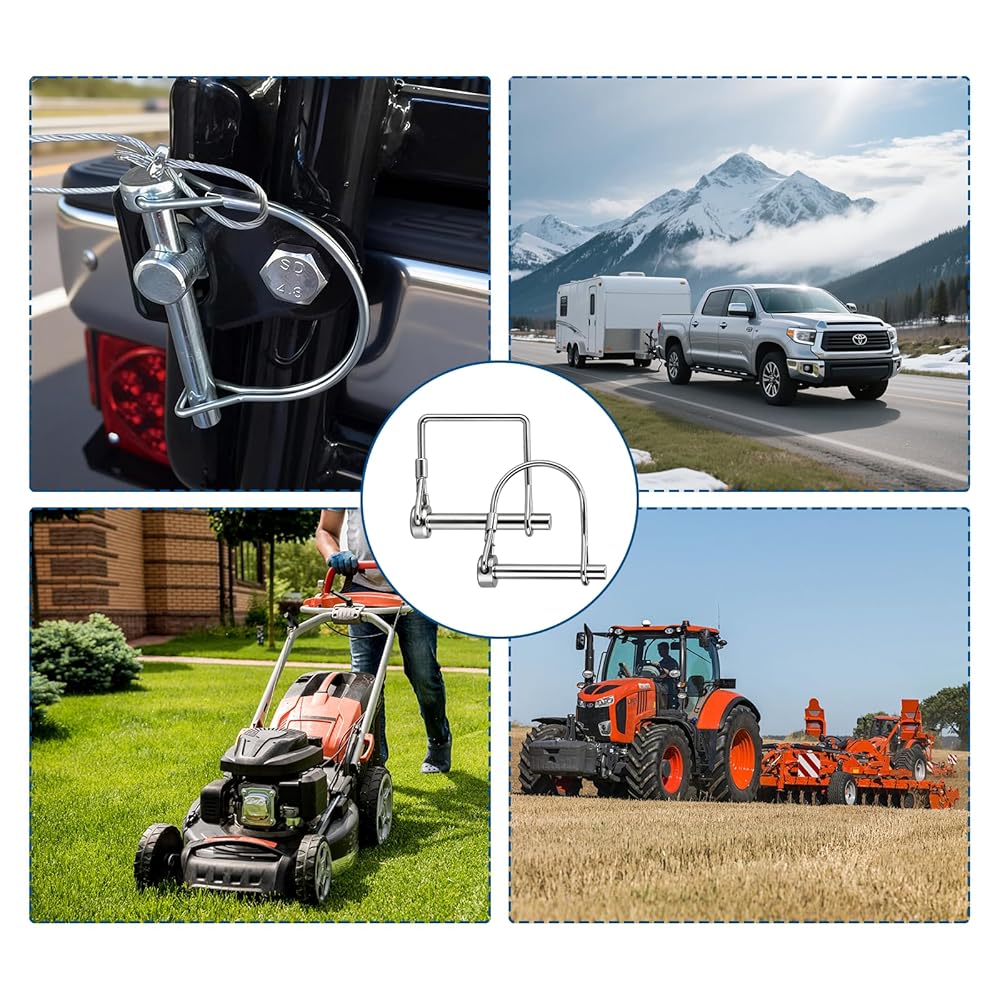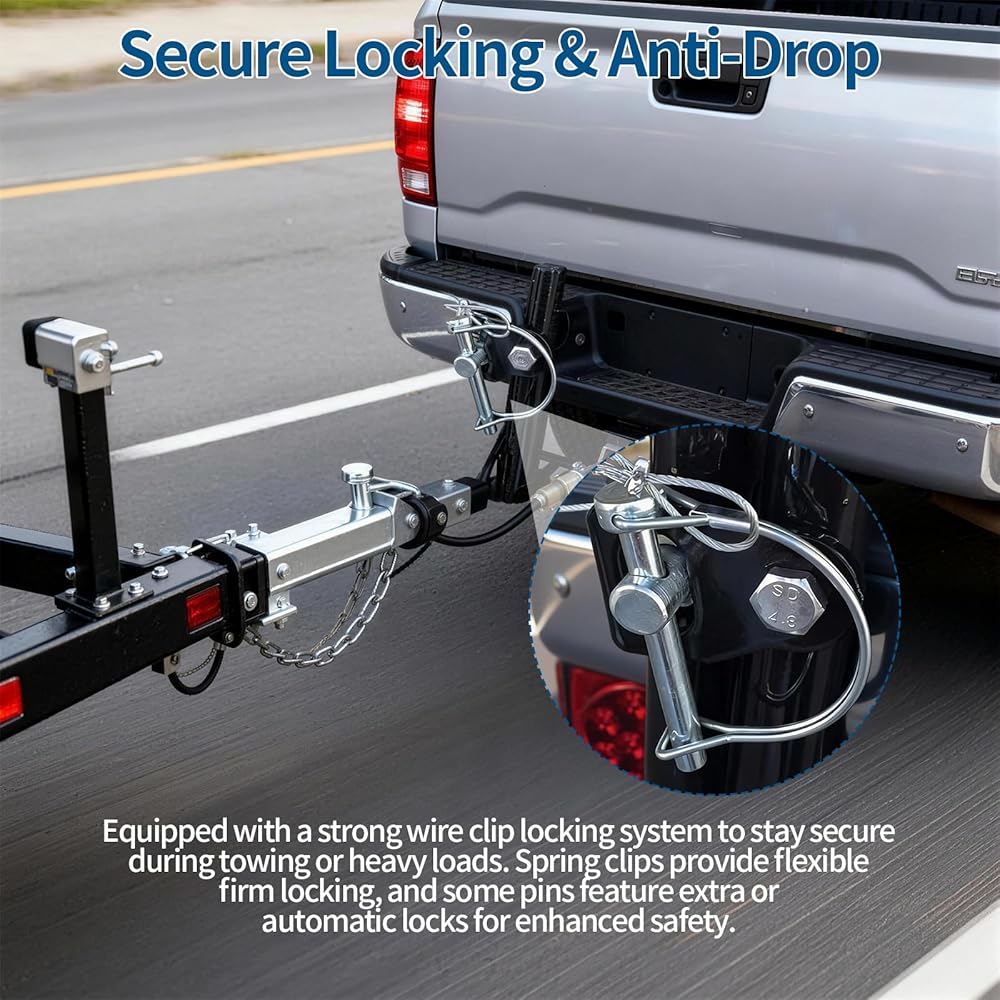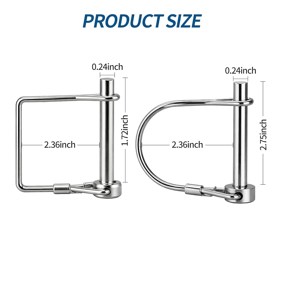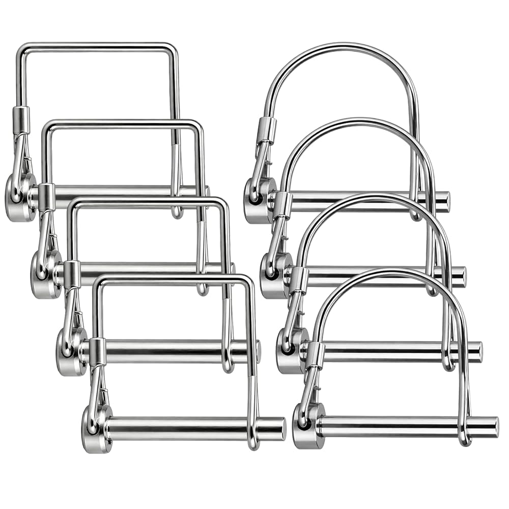 Upgrade your towing and fastening setup with our Trailer Coupler Pin Set, crafted from premium high-strength carbon steel with a durable zinc coating for superior rust and corrosion resistance. Each pin measures 2.75 inches in length and 1/4 inch in diameter, ensuring compatibility with most trailer couplers, towing devices, jack stands, and PTO accessories. The set includes 4 D-shaped pins and 4 square-shaped pins, offering enhanced flexibility and more options for various applications. Our pins feature a secure locking mechanism with a strong wire clip that prevents accidental disconnection during transport or operation. Some pins are equipped with additional safety locks or self-locking clips for added peace of mind. Installation is quick and tool-free—simply insert the pin and secure it with the clip, making it perfect for emergency towing, equipment replacement, or daily fastening needs. Designed for versatile applications, this pin set is ideal for use with trailers, farm machinery, lawn equipment, gardening tools, boat towing, truck hitches, and more. Whether you're securing towing hooks, PTO accessories, jack stands, or other hardware, this set delivers reliable performance for home, farm, and transport tasks. Invest in a dependable solution for all your towing and fastening needs!