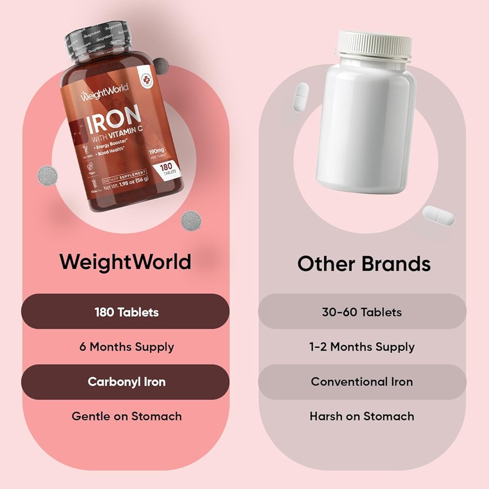 WeightWorld Iron Supplement 65mg - with Vitamin C 125mg - 180 Tablets (6 Months Supply) - Gentle Carbonyl Iron Supplement for Women & Men - Energy Booster & Blood Heath - Vegan, Non-GMO & Gluten-Free