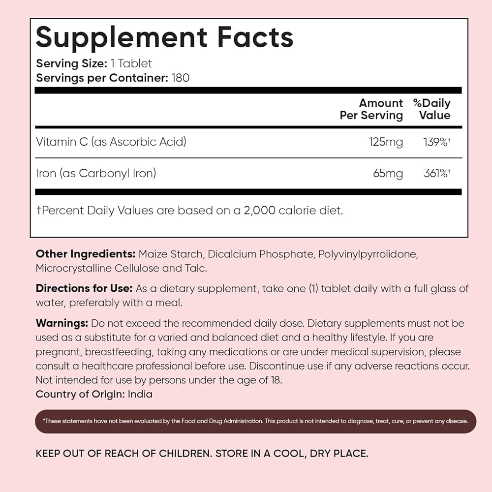 VEGAN IRON, 6+ MONTHS SUPPLY: Suitable for vegans and vegetarians, our iron vitamin C tablets offer a simple and gentle iron pills option for everyday use. Each bottle of our easy iron supplement for women & men contains 180 iron tablets with carbonyl iron 65mg and 125mg vitamin C (ascorbic acid), providing a complete 6-month supply with just one tablet daily. These vegan iron supplements for men & women provide a convenient alternative to liquid iron supplement, requiring no measuring & mixing.