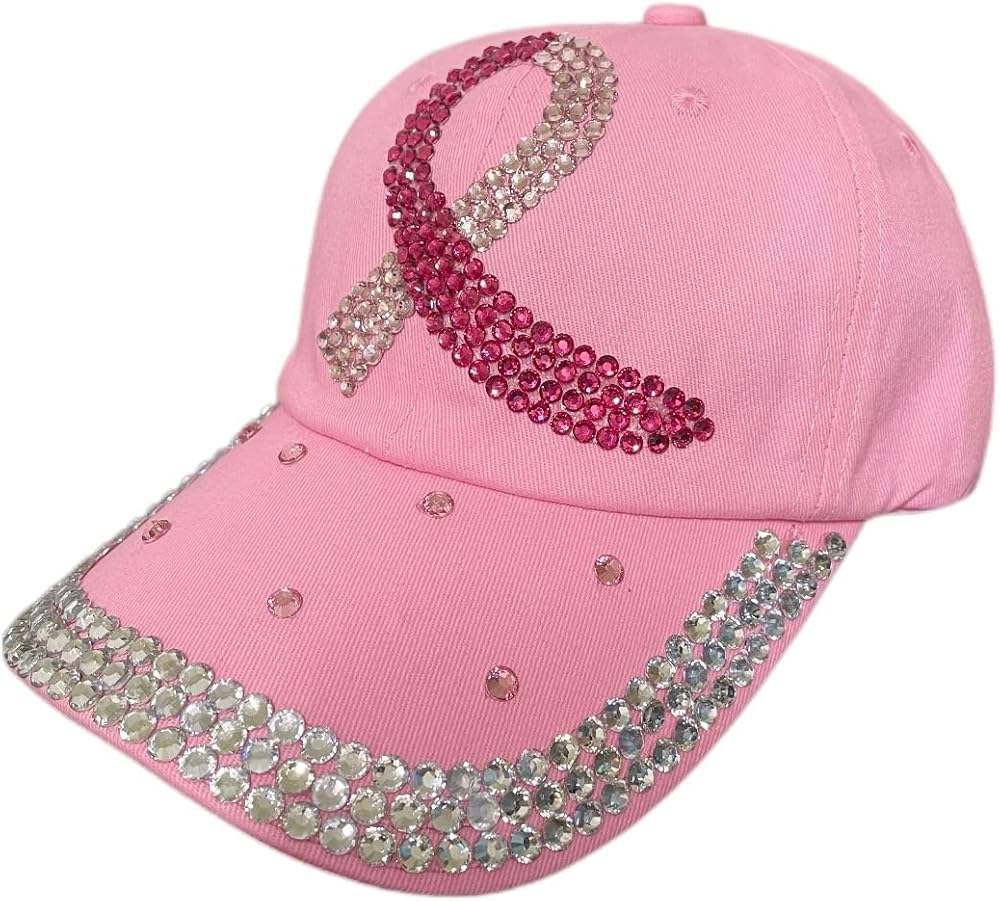 A one size fits all gift for breast cancer survivors and their supporters A two toned pink ribbon with hot pink on the outside and silver on the inside. Embellished with Rhinestones Bill is 7 7/8" rounded This hat has an adjustable back and will fit most adults.