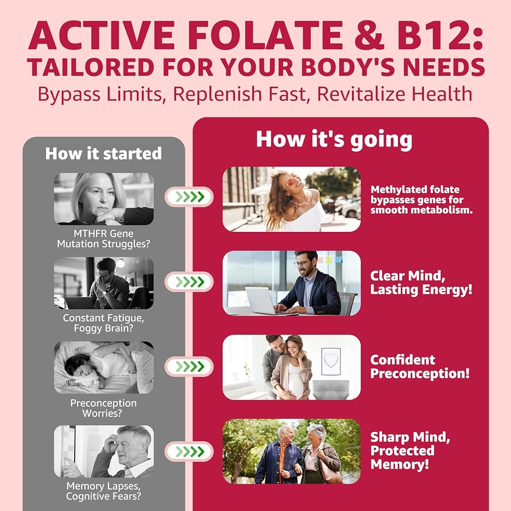 🎯[Methylation B-Complex for Energy & Focus] - The Folate & B12 gummies combine potent B-vitamins to optimize cellular energy, enhance focus, and support nervous system function. This blend promotes efficient metabolism, helping you stay men●tally clear and physically energized, ideal for anyone looking to boost focus and maintain a balanced, active lifestyle.