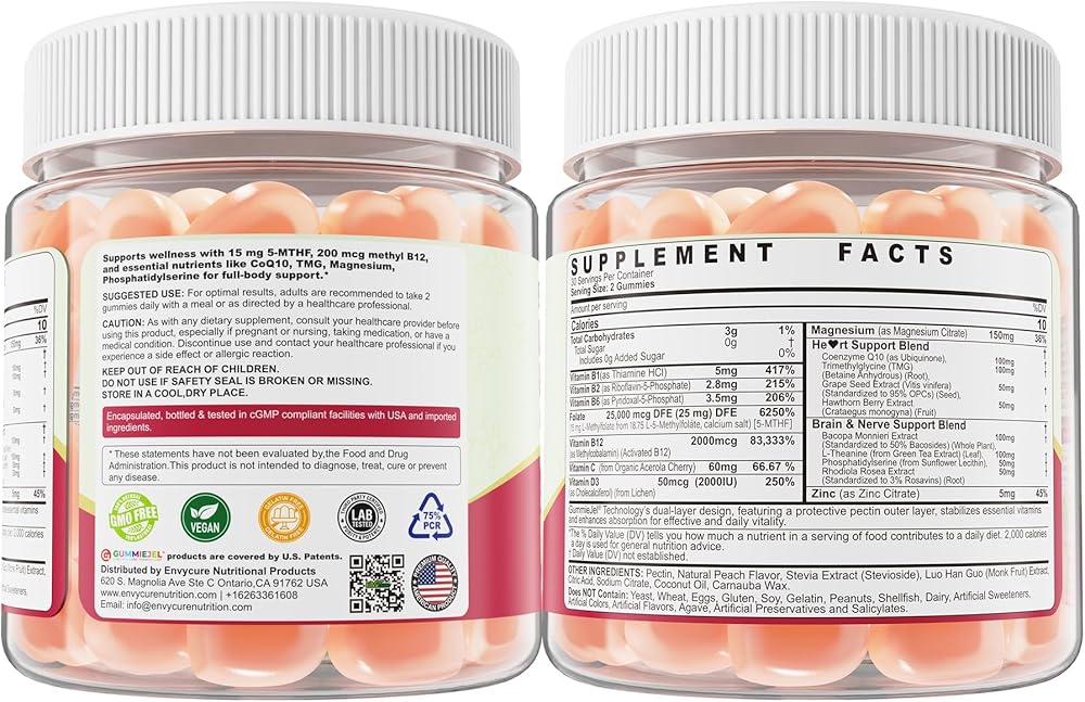 🌟[Active Folate + Methyl B12 for Maximum Absorption] - Our high-potency folate gummies deliver 15 mg of L-Methylfolate (5-MTHF), the most bioavailable form of folate that the body can absorb quickly and efficiently. Combined with 2,000 mcg of Methyl B12, these active nutrients support healthy methylation, homocysteine breakdown, and optimal energy levels. Our liquid-center technology ensures gradual and sustained absorption, giving your body consistent, long-lasting benefits from each gummy.