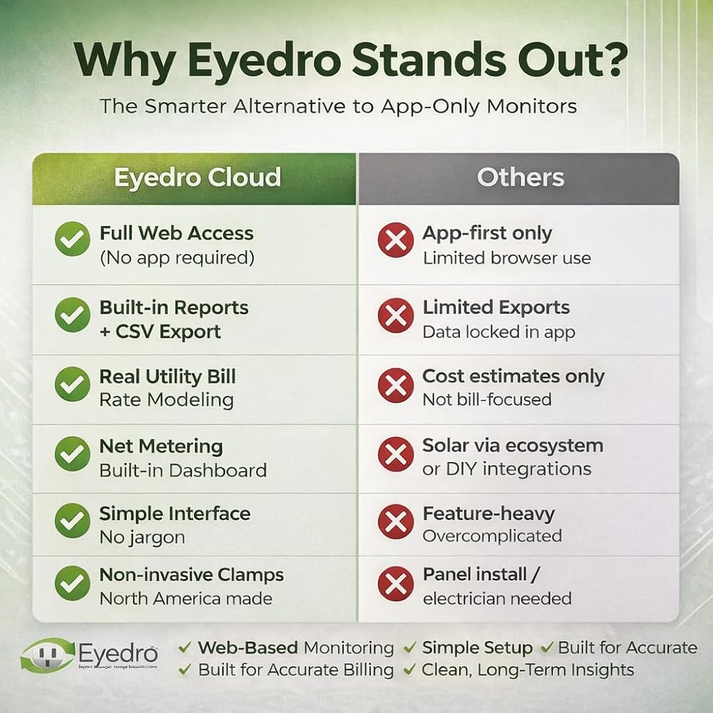 Eyedro – Real Data, Real Savings: Trusted by homeowners and professionals for over a decade, Eyedro's electric meter is dedicated to making energy monitoring simple and effective. Our mission: help you reduce waste, save money, and take control of your electricity with reliable, easy-to-use technology built to last.