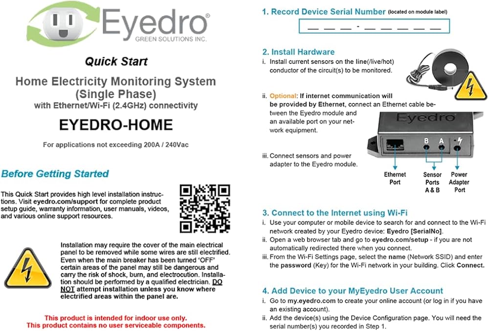 Smart, Precise, and Easy to Use watt meter: Includes two 200A sensors, Ethernet cable, power adapter, and access to the MyEyedro cloud (no subscription). Compatible with WiFi or wired Ethernet, and supports solar, grid, or net metering. Track usage across devices, appliances, or circuits. Built to meet North American safety standards. Compatible with 2.4 GHz WiFi.