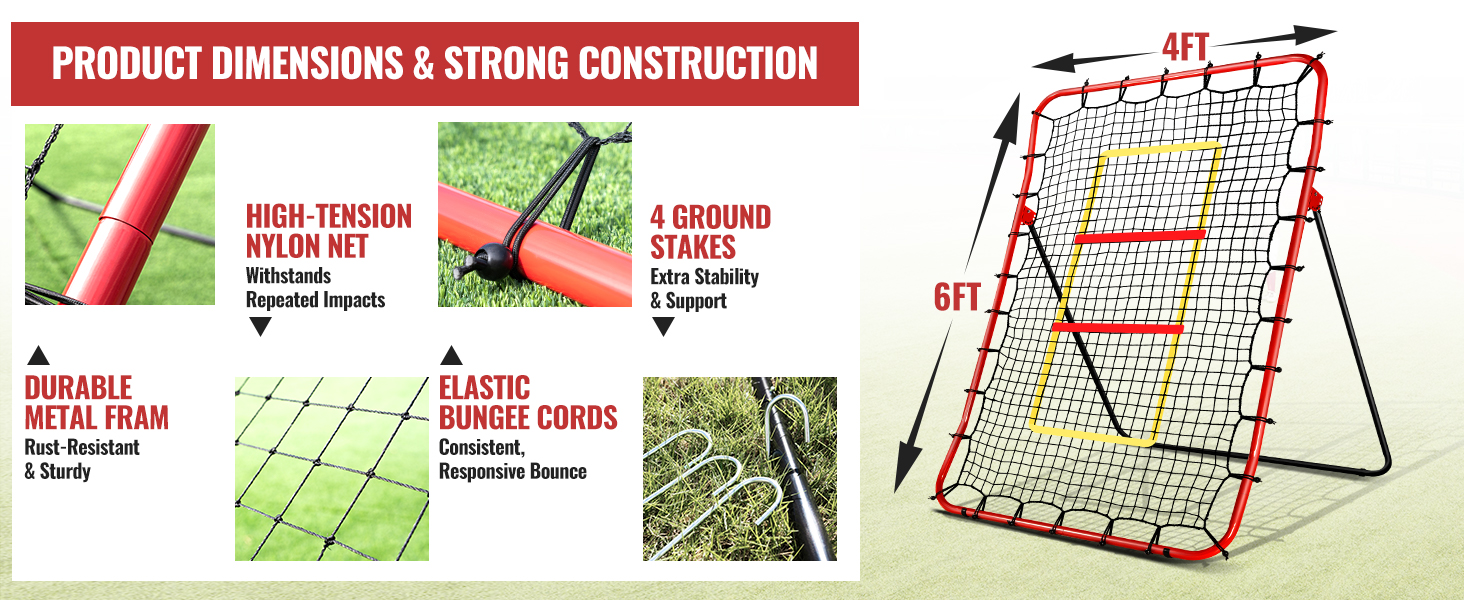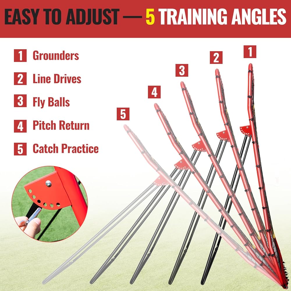 ⚾ 【EASY TO ADJUST — 5 TRAINING ANGLES】The 6x4FT baseball rebounder adjusts to 5 different angles to simulate grounders, line drives, fly balls, pitch return, and catch practice. Ideal for infielders and outfielders to improve fielding, catching, and reaction skills.