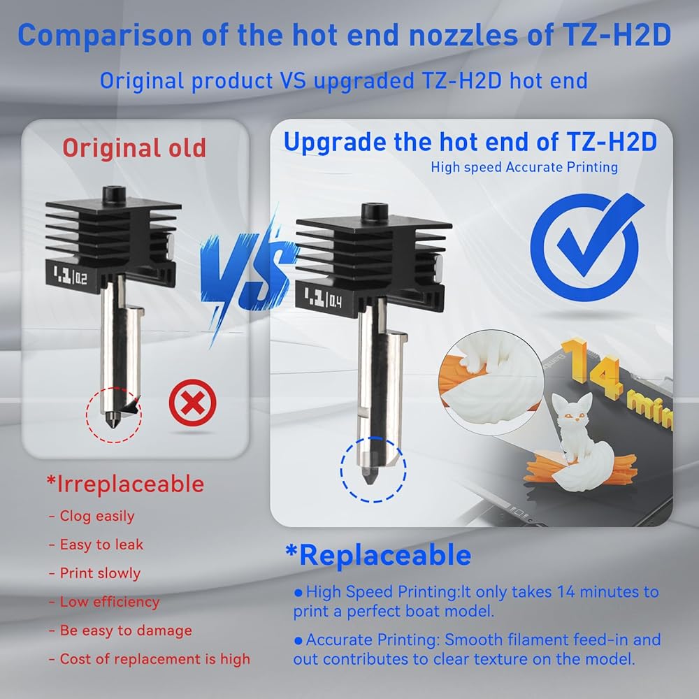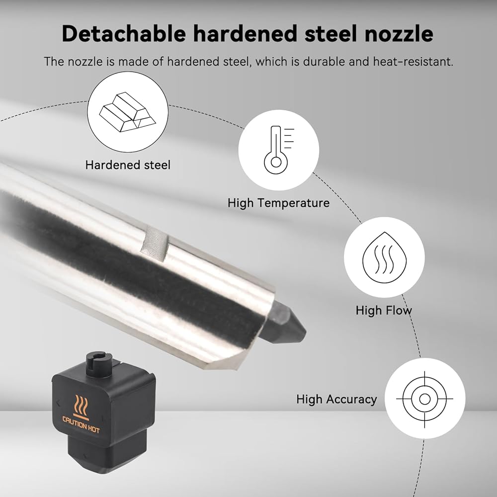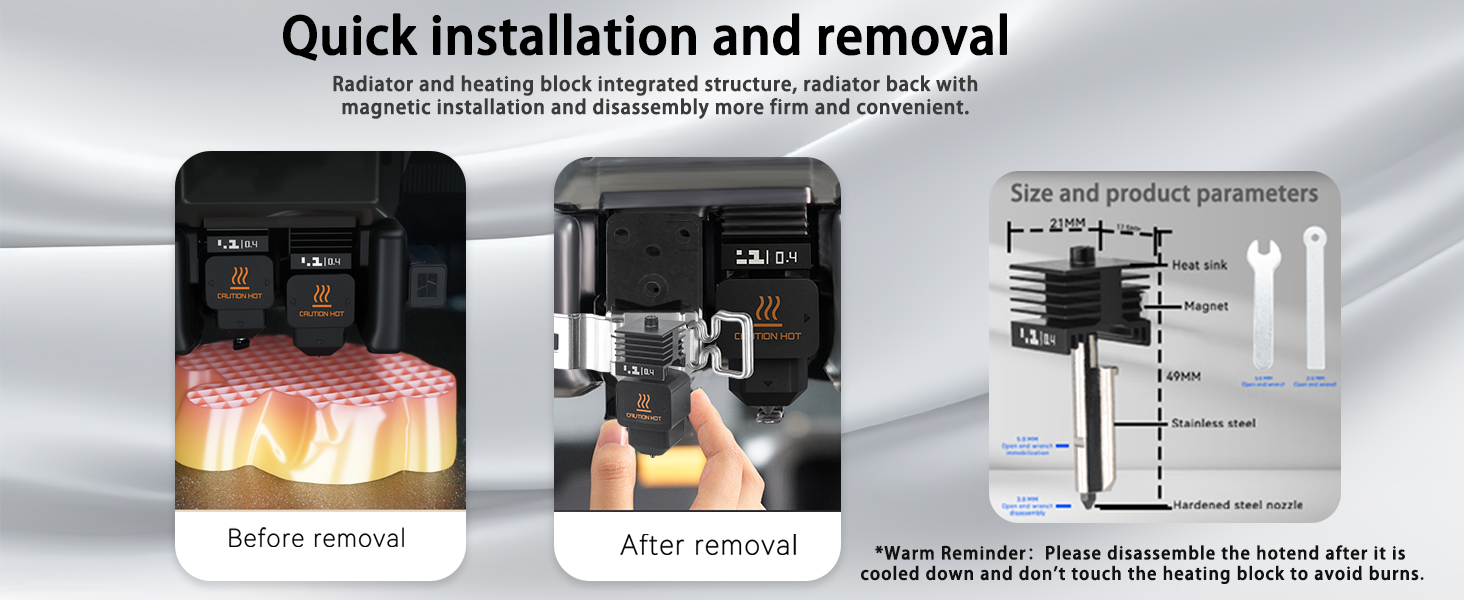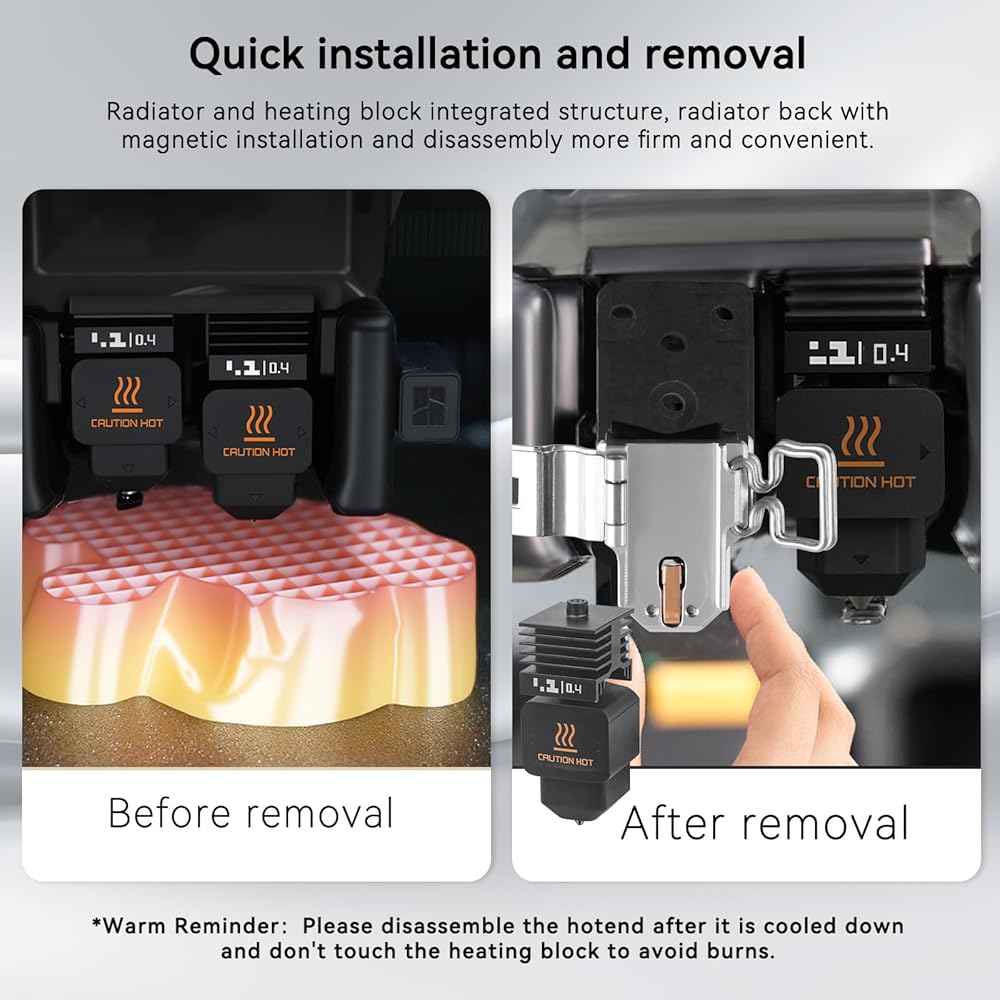 Easy to Install:The H2D hot end is designed cleverly, and its disassembly and installation can be easily and quickly completed by simply unlocking the lock catch. Note: Please replace it after cooling the hot end, and avoid direct contact with the heating block during replacement to prevent scalding.