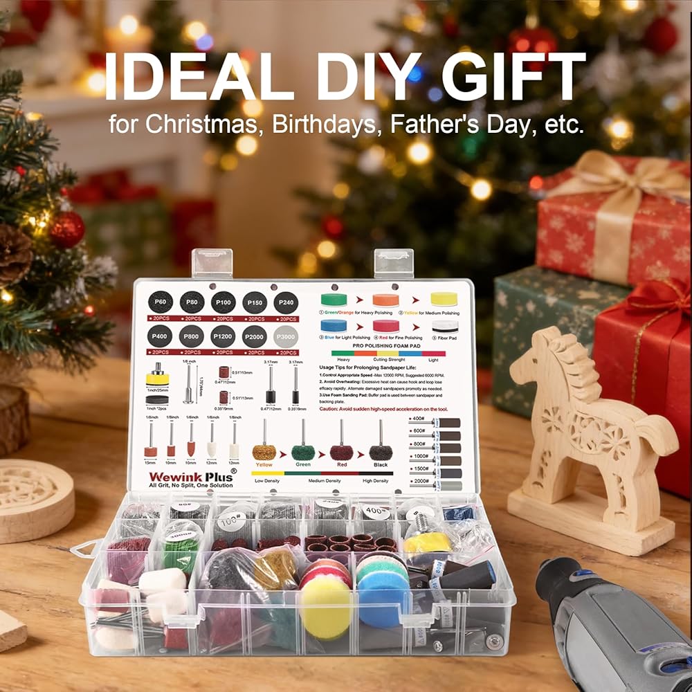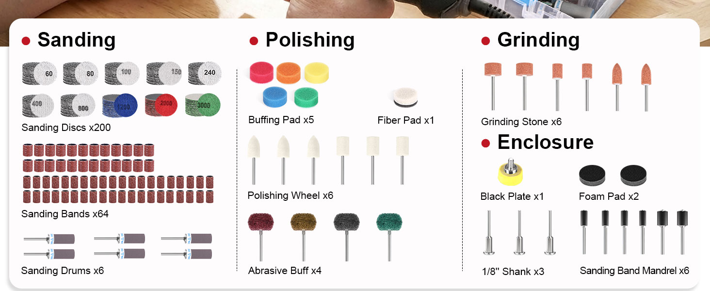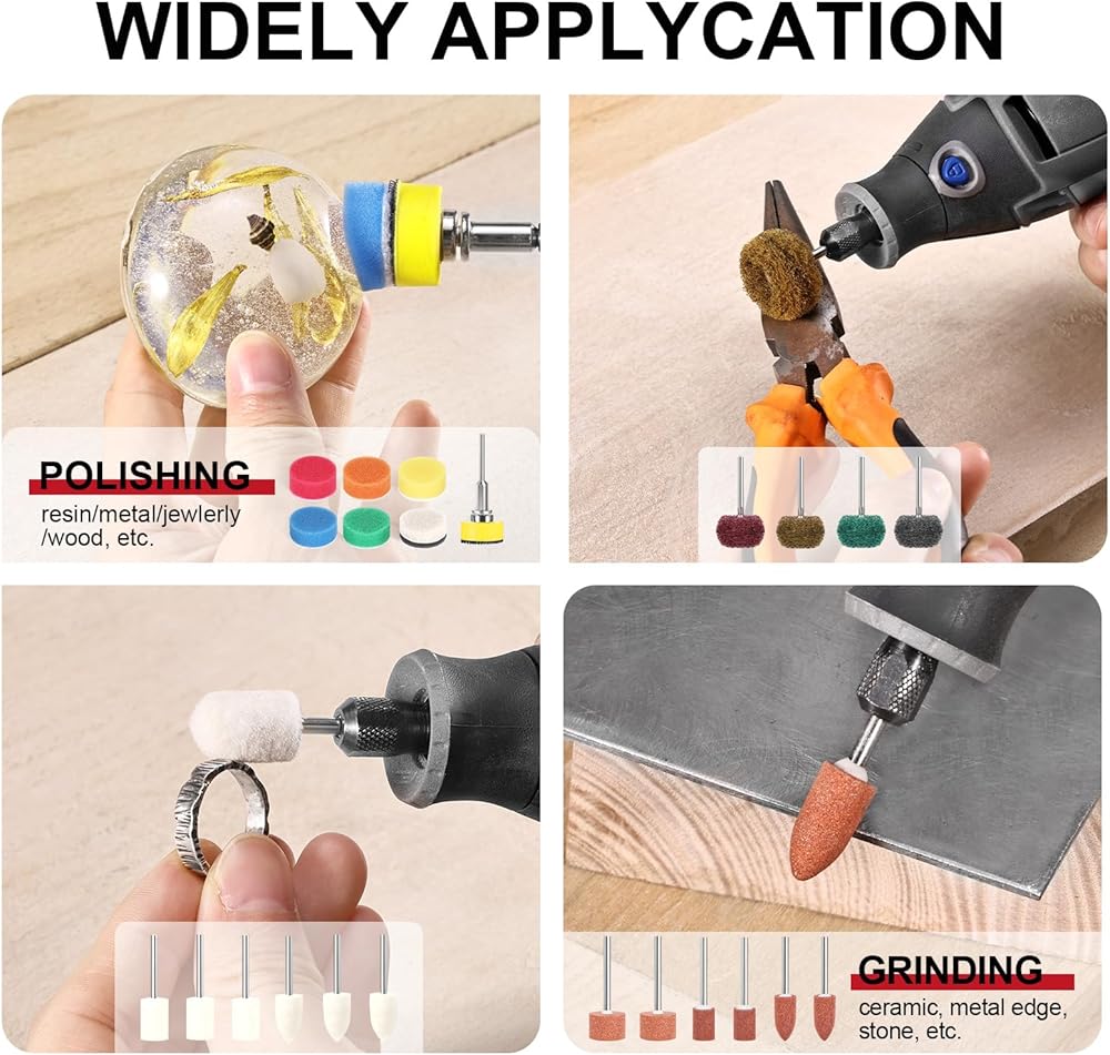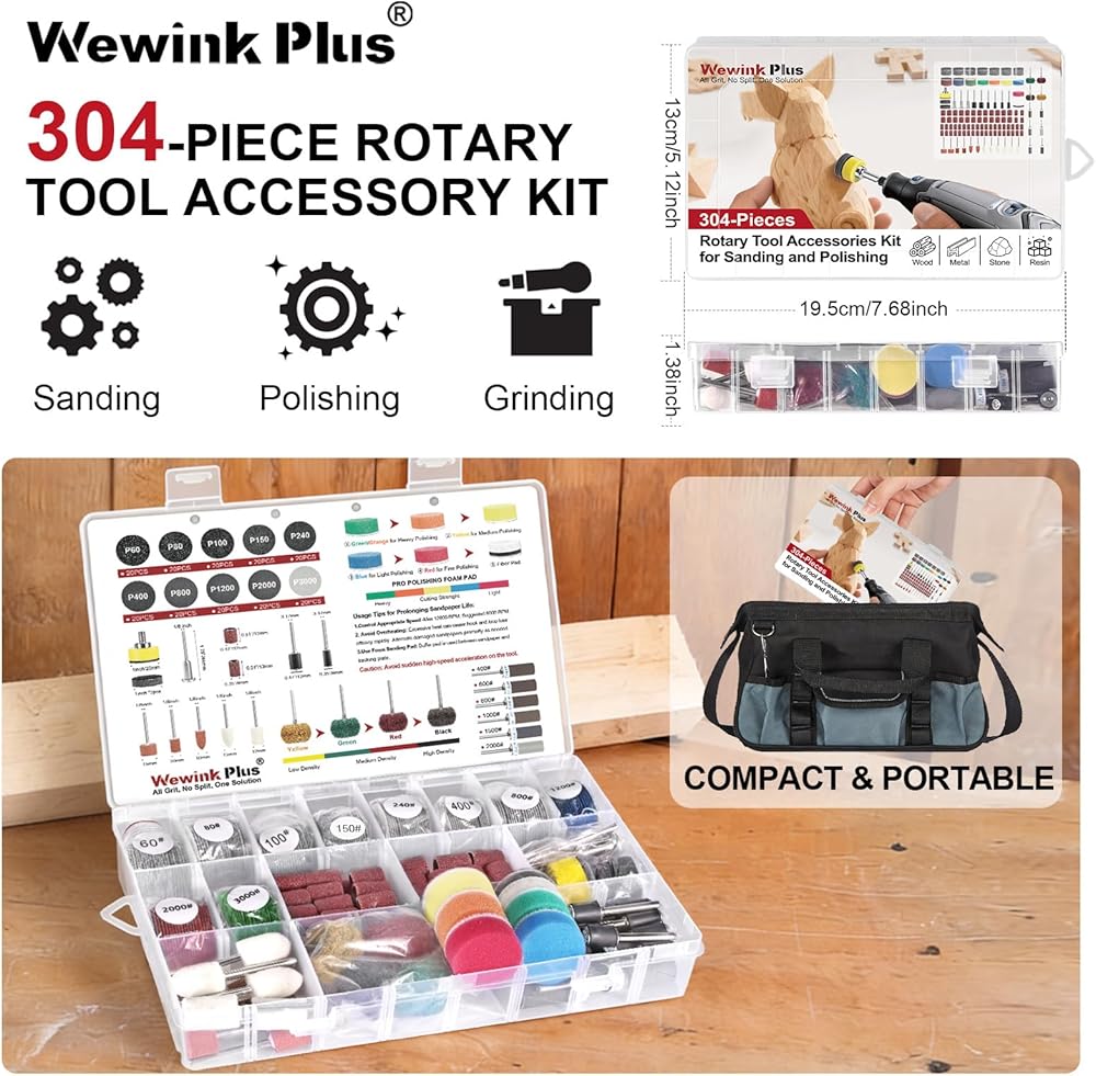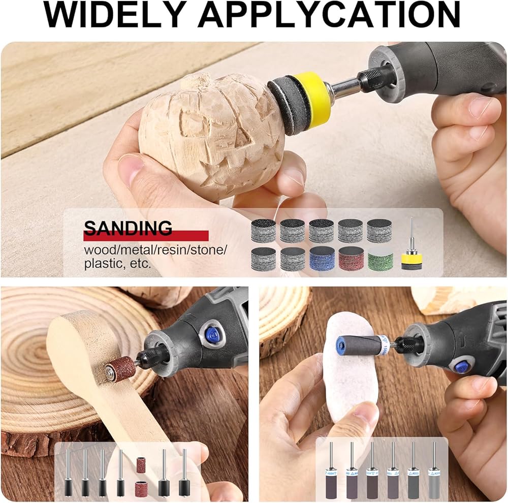 Comprehensive 304PCS Set: This ultimate rotary tool accessory kit includes 1-inch sanding discs(60/80/100/150/240/400/800/1200/2000/3000, each 20pcs), polishing pads, sanding drums, felt polishing pads, abrasive buffing wheel, and grinding stones. A one-stop solution from heavy-duty grinding to mirror-like polishing, saving you time and money on individual purchases.