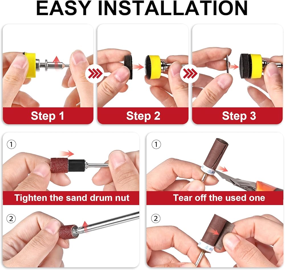 Premium Durability: Made with high-quality aluminum oxide and silicon carbide, our abrasives stay sharper for longer. The hook-and-loop design makes disc changes quick and easy. When the sanding drum sandpaper surface is worn, just tear off the used surface to get a new polishing wheel, which effectively saves costs and reduces waste