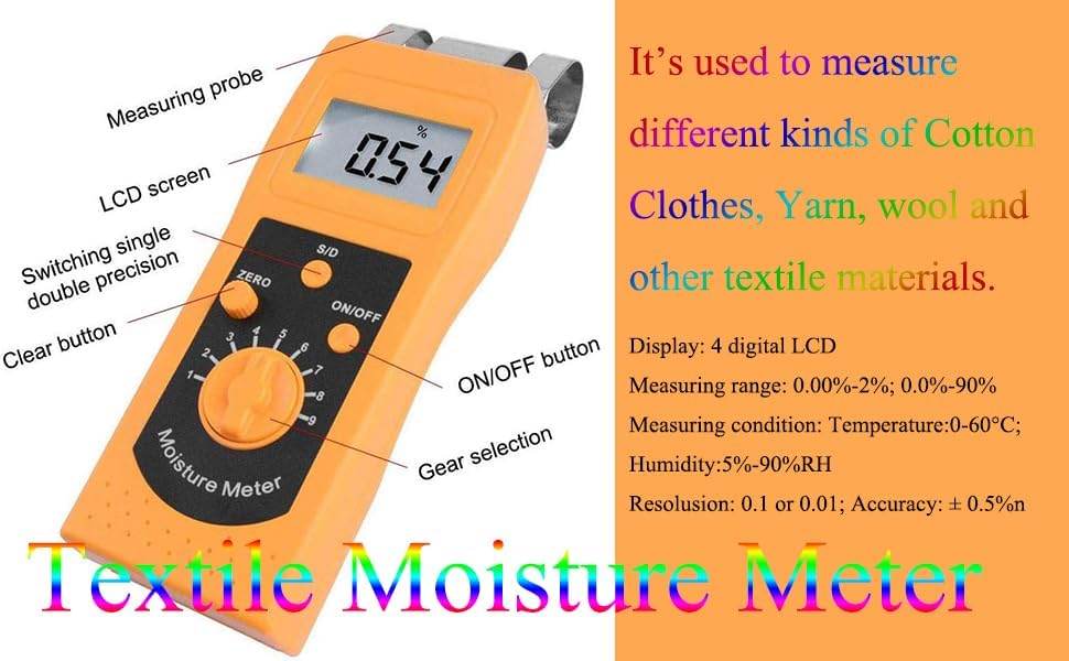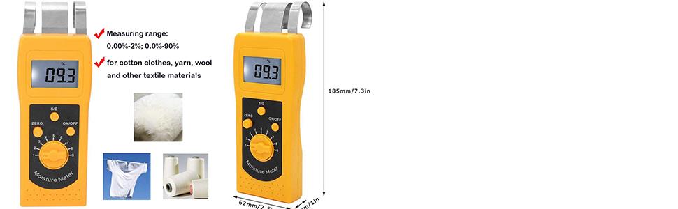 This digital moisture meter is a high-quality instrument to measure the clothes moisture with wide measuring range and high resolution. Equipped with ten gear is used to measure different kinds of cotton, clothes, yarn, etc.