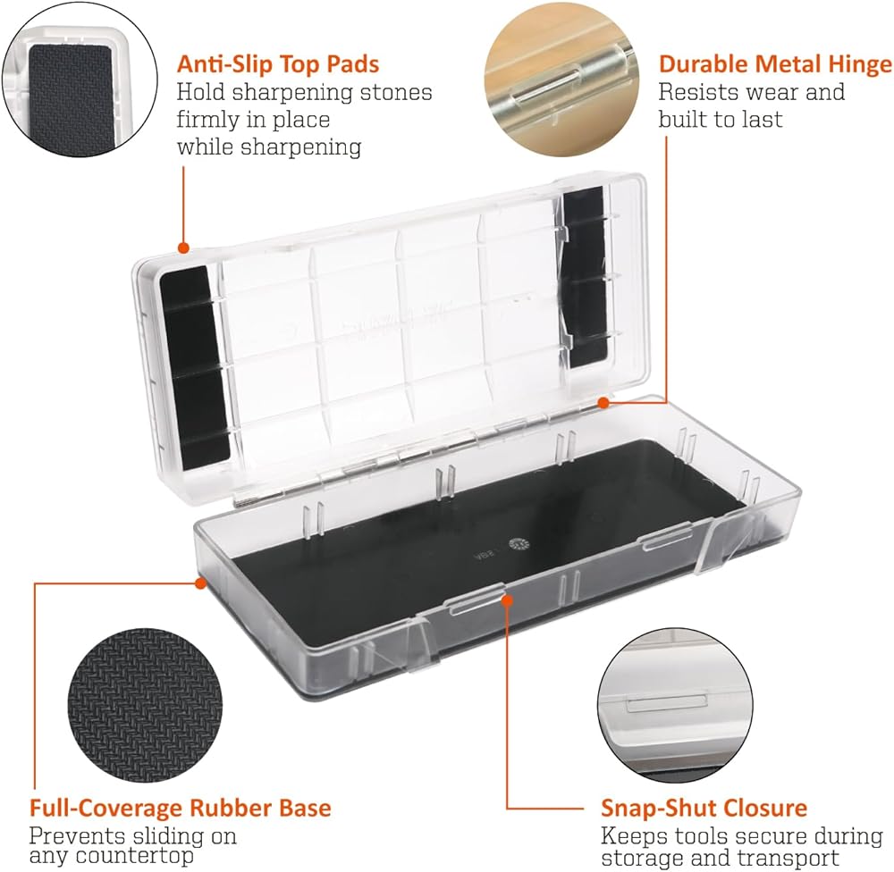 𝐃𝐮𝐚𝐥-𝐅𝐮𝐧𝐜𝐭𝐢𝐨𝐧 𝐃𝐞𝐬𝐢𝐠𝐧: Each unit functions as both a non-slip whetstone and diamond sharpening stone holder during use and a protective storage case when not in use.
