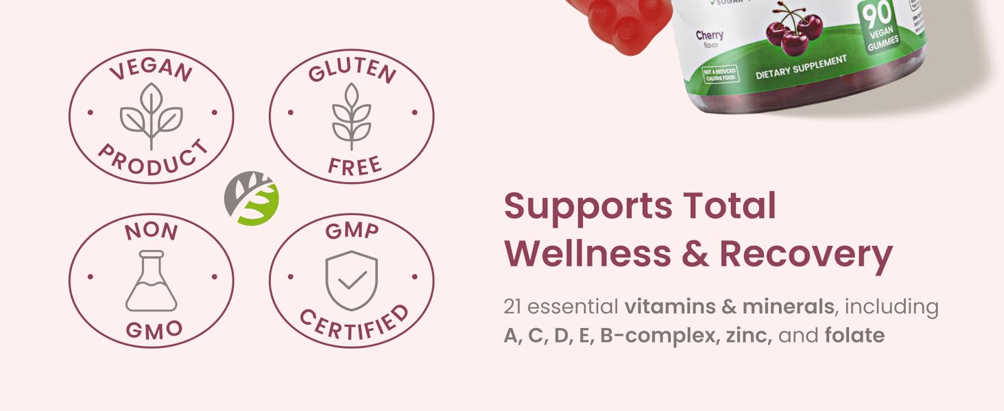 Tasty Cherry Flavor with No Added Sugar: Say goodbye to chalky tablets and unpleasant aftertastes. These smooth, sugar-free, cherry-flavored multivitamin gummies feature a naturally sweet cherry flavor that makes your daily multivitamin routine feel like a treat. No artificial colors, no added sugar—Just pure goodness that is gentle on your stomach.