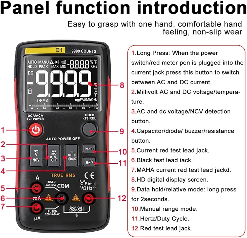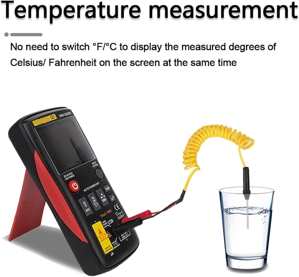 1. The signal generator is small in size, has many functions, easy to operate and easy to carry.2. The key layout is reasonable, all functions have independent corresponding keys, easy to operate.3. Built-in battery, low power consumption, long standby time.FeaturesItem name: MultimeterColor :redModel Number: Q1Operating Temperature: 0 - 40 Operating Humidity: 75%RHStorage Condition: -2060Storage Humidity: 80%RHDIY Supplies: ElectricalOperating Mode: Auto/Manual RangingMeasuring Inductance Range: NoMeasuring Temperature Range: -201000 C/-4F-1832FMeasuring Capacitance Range: 9.99nF/99.99nF/999.9nF/9.99uF/99.99uF/999.9uF/9.999MFMeasuring Voltage Range: 999.9mV/9.999V/99.99V/999.9VMeasuring Current Range: 999.9uA/99.99uA/999.9mA/10AMeasuring Resistance Range: 99.99/999.9/9.999k/99.99k/999.9K/9.999M/99.99M OhmFrequency: 99.99Hz/999.9Hz/9.999KHz/99.99KHz/999.9KHz/5MHzDisplay Type: Digital DisplayDiode Test: YesContinuity: YesDuty Cycle: 1%-99%Sample Rate: 3 times per secondPower: 2 x 1.5V AA batteries(Not Included)Note:There might be little error of size for manual measurement.The colors deviation might differ due to different monitor, please kindly understand.Package Included:1 x Multimeter1 x Temperature sensor1 x Test line1 x Instructions1 x Storage package