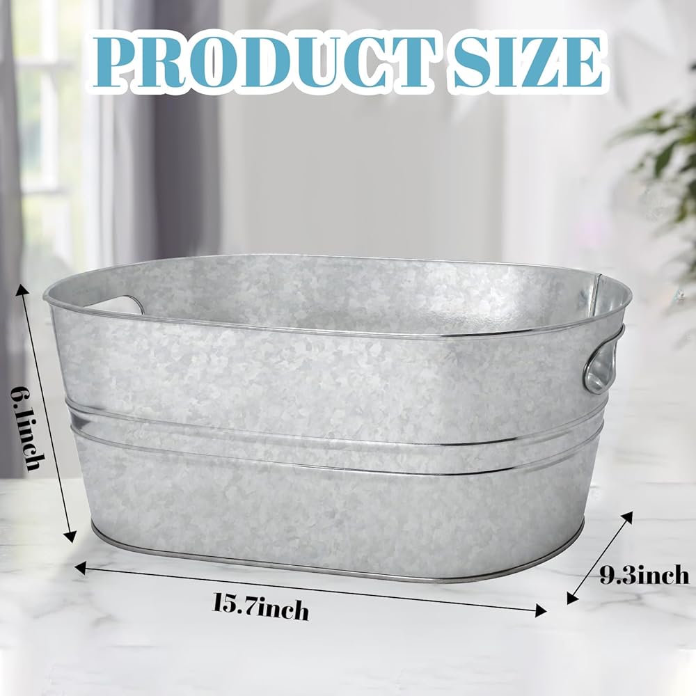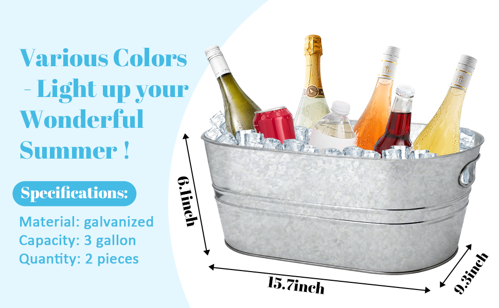 3 Gallon large capacity: The capacity of metal beverage bucket is 3 gallons, Dimensions are 15.7 "L x 6" H, this tub can accommodate plenty of bottles, cans, and ice, making it a practical choice for parties and events where you need to keep a variety of beverages cool