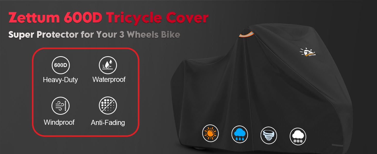 | Windproof & Waterproof | - Made of premium 600D oxford fabric with PU coating, Zettum bike cover is durable and waterproof; Our electric tricycle cover can withstand up to 10000 Pa water pressure. The generous size covers your entire adult tricycle, with close double stitching and 2 dual heavy-duty buckles on the bottom that prevent from rain,storm or heavy winds.