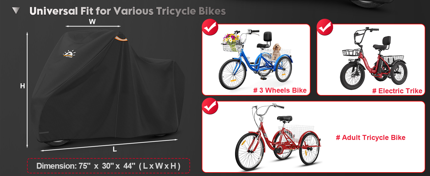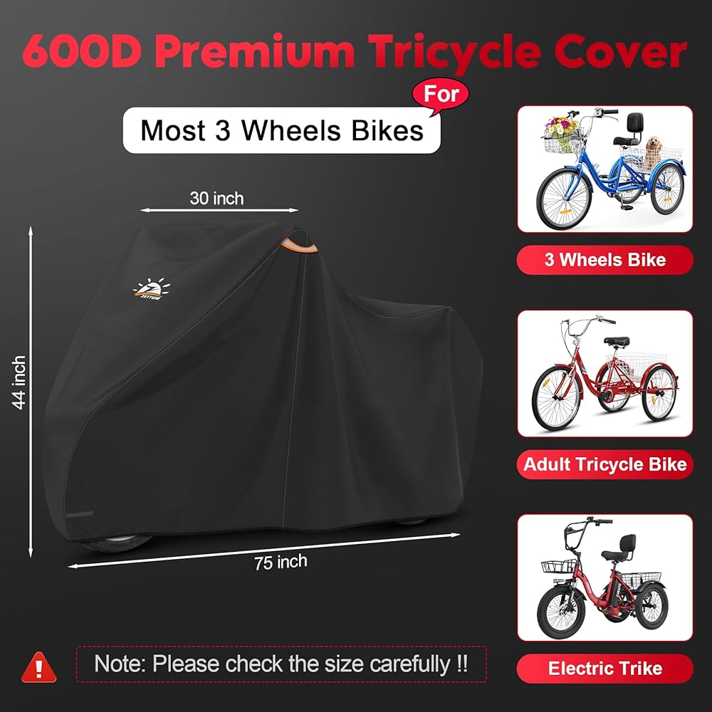 |Premium Adult Tricycle Cover| - Zettum trike cover features waterproof, dustproof, and UV-resistant protection, ensuring your etrike is safe from rain, dust, and damage whether indoors or outdoors. Its design fits most three wheel bikes with dimensions: 75"L x 30"W x 44"H