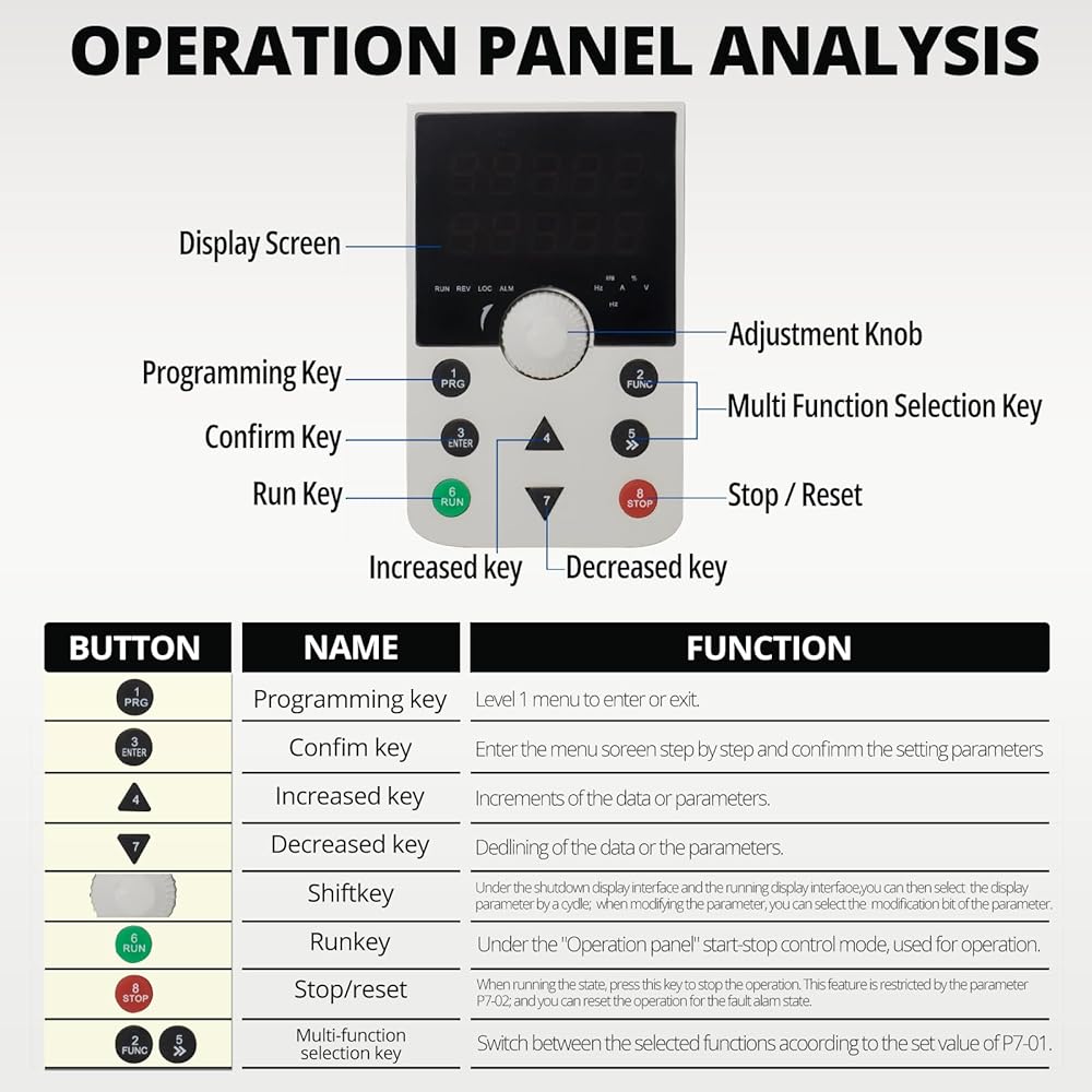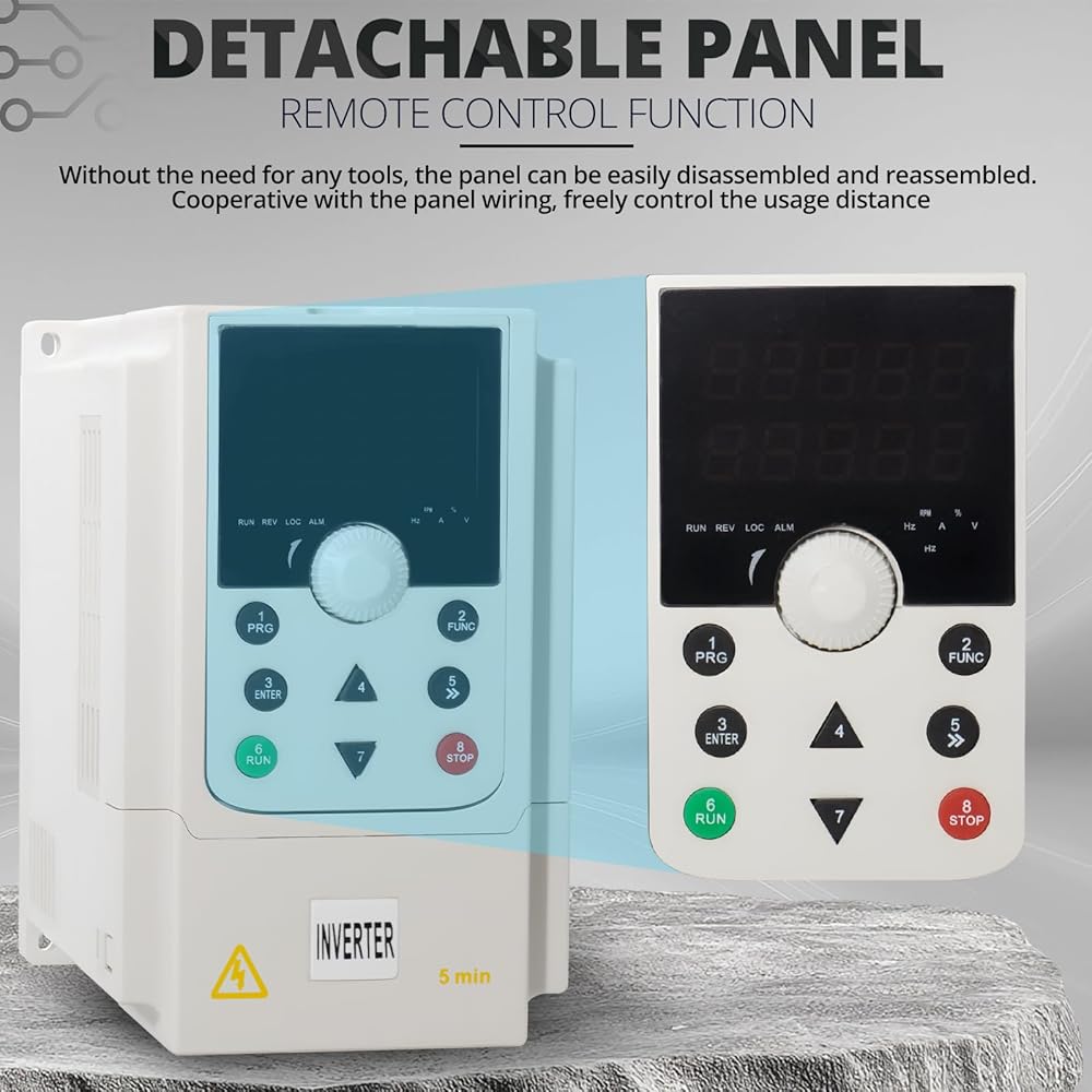 【Intelligent Control and Stable Communication】:The vfd 220v input 220v 3 phase output is equipped with a digital display panel and a detachable design (standard 7.9inch connection cable), supporting remote control and potentiometer speed adjustment. It has an internal RS485 communication port and a rich set of digital/analog control terminals, meeting diverse and complex control requirements, making device integration and automation upgrades simple and efficient.
