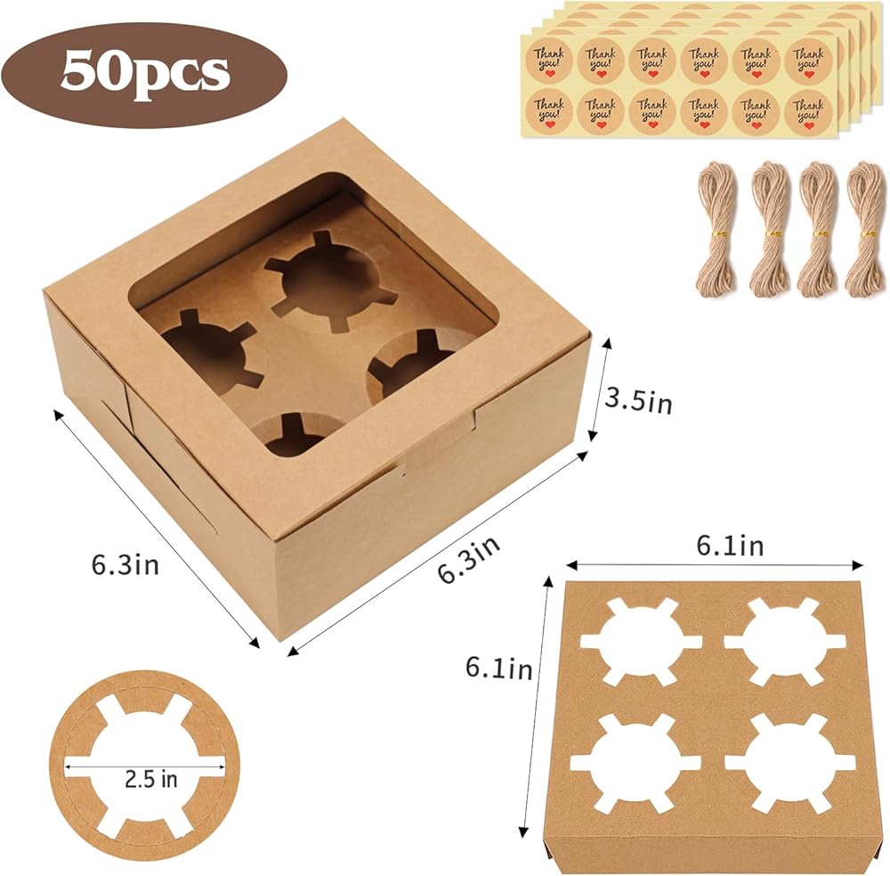 TOMNK 50 PCS Cupcake Boxes with Window, 6.3x6.3x3 Inch Cookie Boxes, Brown Bakery Containers for Pastry, Dessert, Chocolate Strawberries, Treat Boxes with Stickers and Jute Twine