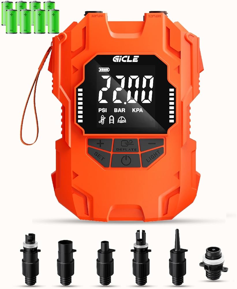 Easy Inflation with Double-stage and Auto-off Functions Automatic double-stage electric sup air pump: This intelligent sup electric paddle board pump for both air inflation and deflation adopts adjustable PSI air pressure setting, and displays preset pressure options. Sup Air pump automatically stops inflation when reaching the required pressure without damaging your paddle board, inflatable mattress or pool toys. · High Pressure: 22PSI · Current & Power:10A, 12V · Sup pump Size: 24*18*8.6 in; · Air Pump net Weight: 3.3 lb. · Battery: 2000mh*8. 14.8V, 59.2Wh Our paddle board pump have different setting modes, and have different default pressure value--- Blank mode: 0-22psi/0-1.51bar, default pressure value-10PSI, step value 0.5PSI Paddleboard mode:0-20psi, default pressure value 12PSI, step value 0.5PSI Boat mode:0-8psi, default pressure value 1.5PSI, Step value 0.1PSI Tent mode:1-10psi, default pressure value 5PSI, Step value 0.1PSI Accessories: 6 keys, respectively, Power , SET button, "-" button, "+" button LCD "Deflate"button “Light” button key logic: Inflation operation: 1. Select the "SET" to be used, the initial blank mode, the display is 10.00psi, press "SET" 1 time to switch to Paddle board mode, display 12.00psi, press "SET" again to switch to boat mode, display 1.5psi, press "SET" again to switch to tent mode, display 5.00psi, press "SET" again to return to blank mode cyclicly. 2.A longer press"SET" key for 3 seconds ;cyclicly to switch the pressure value unit, from PSI to BAR to KPA; 3. Set the pressure value you need; 4. Start inflation with dual motors at the same time; Deflate operation: Switch the air hose connection; Press the "Deflate" button enter into deflation mode; Lighting: The air pump for paddleboard provides three lights: outdoor lighting, SOS rescue, and flash explosion-proof, which adds a safety protection for the convenience of your outdoor travel;