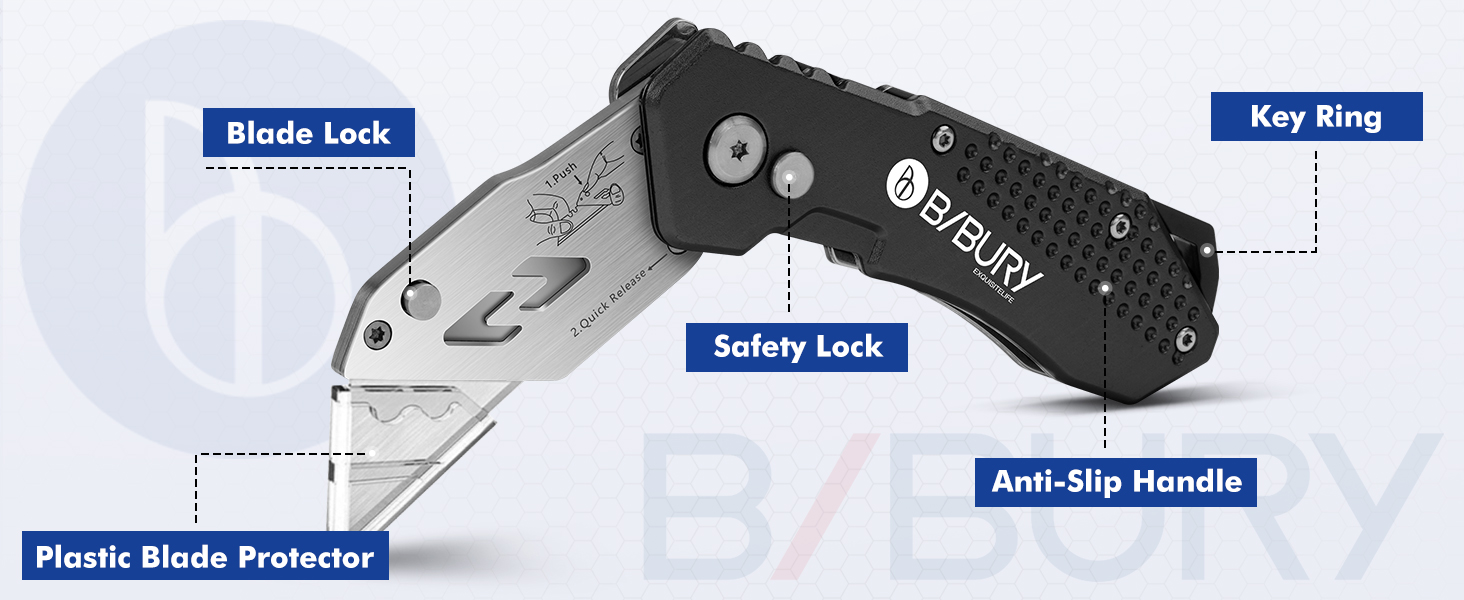 Safety Use: BIBURY utility knife has a small plastic protector on the blade tip, and a safety lock on the body, which can ensure safe use, especially safety lock can keep the blade in place when you do not use the box cutter and protects you from hurts